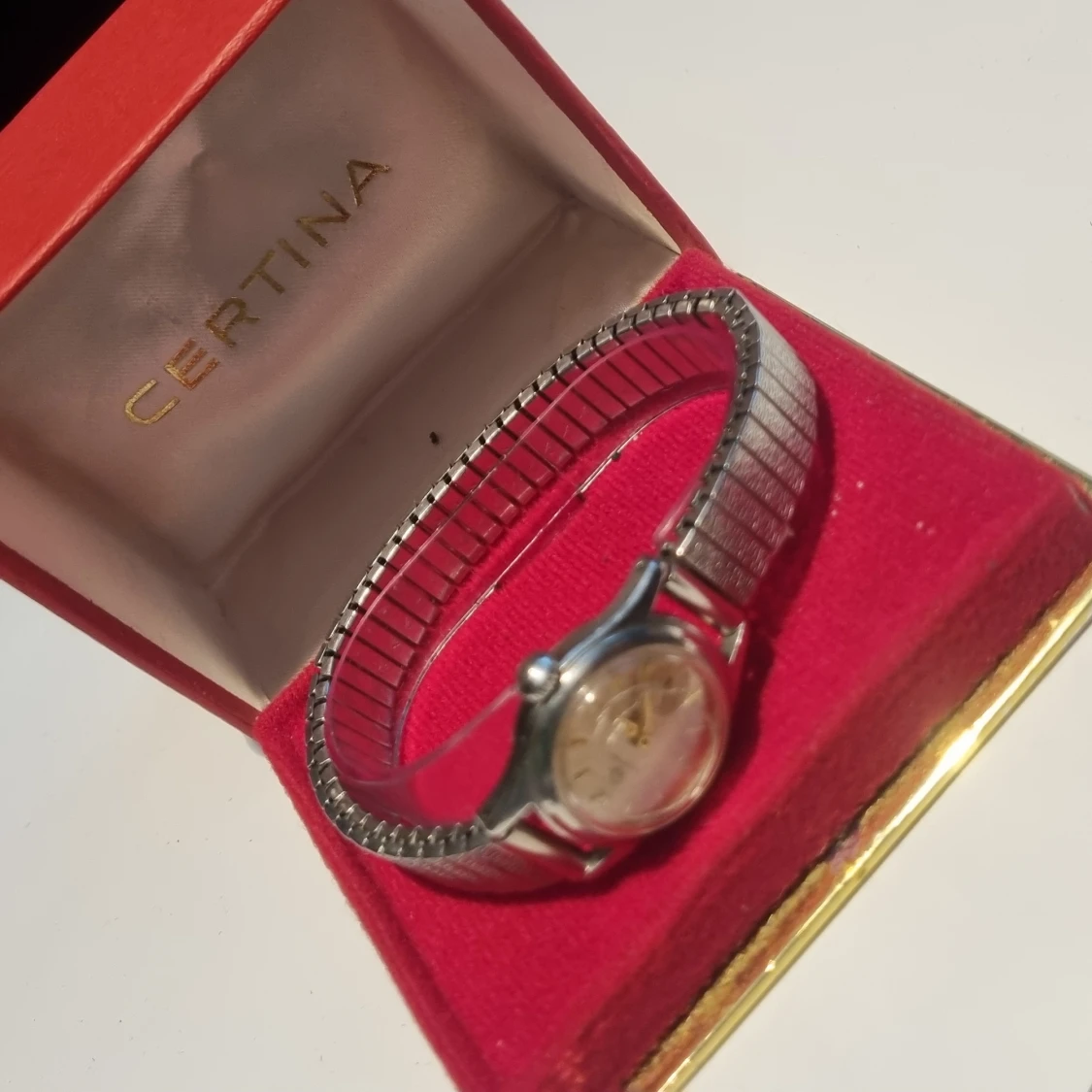 Fint bruksskick, Schweizisk klocka som är waterproof till 10 atm, den är från 40talet så åldersmärken finns. Tickar och går, man drar upp den själv