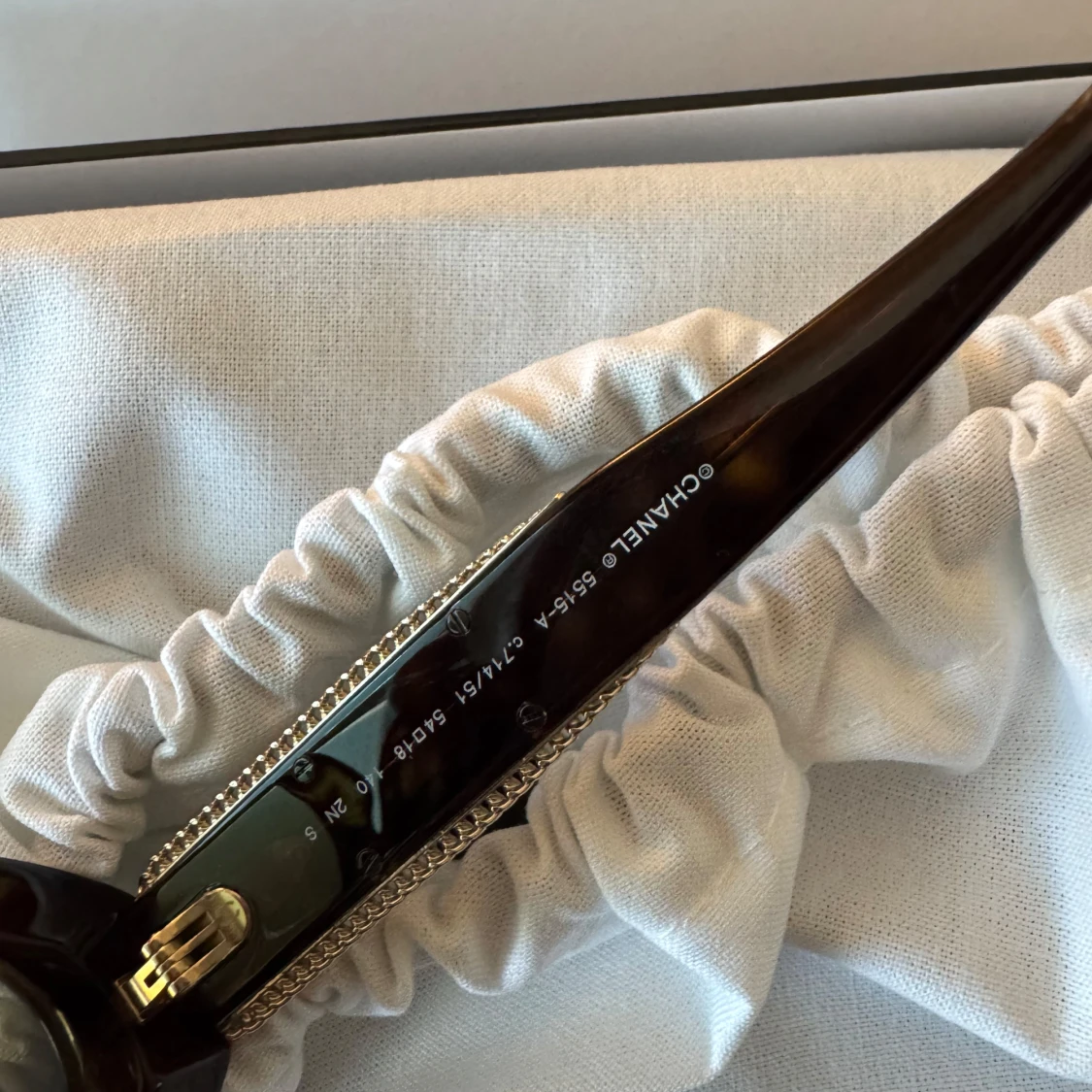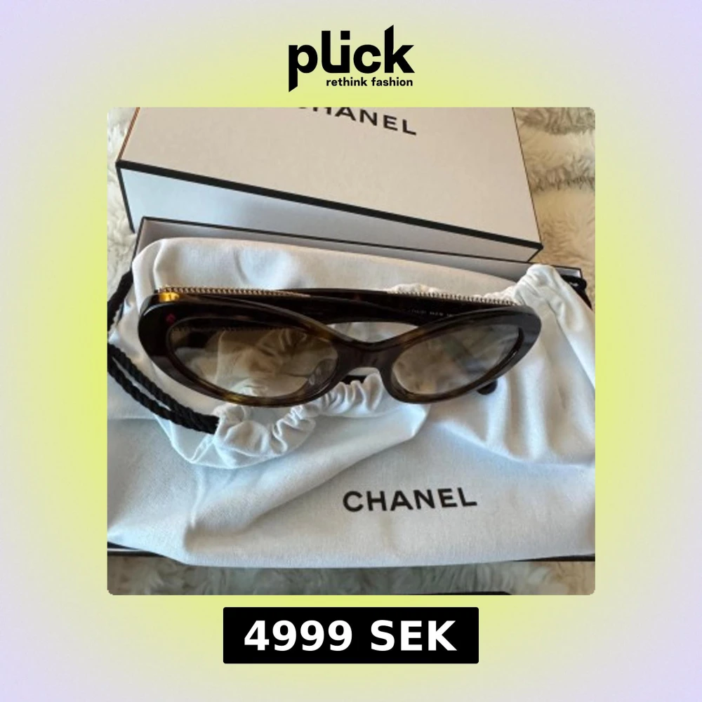 Snygga ovala solglasögon från Chanel i brunmelerad plast med gulddetaljer och kedja längs bågen. Ikonisk design med exklusiv känsla, perfekt accessoar för att lyfta din stil. Levereras med originalfodral och box.