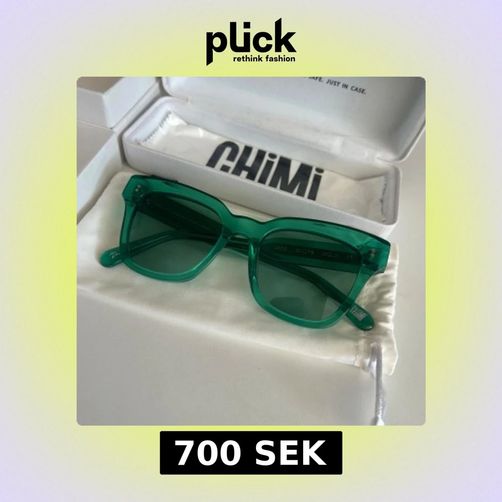 Snygga gröna solglasögon från CHIMI, modell #005 Aqua. Rektangulär form med transparent grön båge och matchande gröna linser. Kommer med originalfodral och putsduk. Perfekt för dig som vill sticka ut med färg och stil. Aldrig använda.