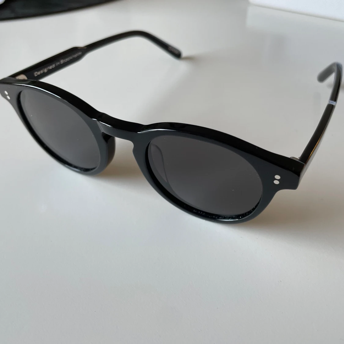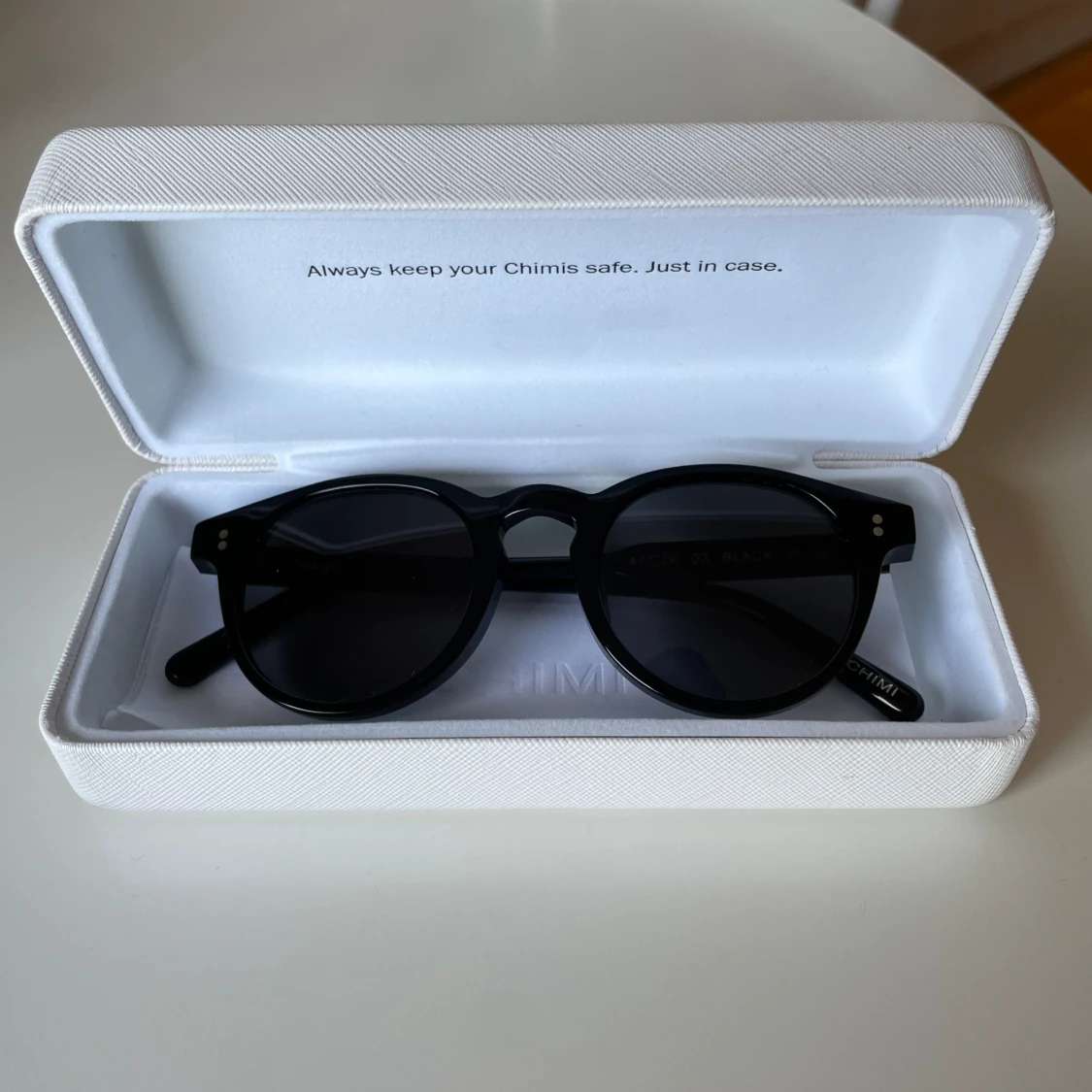 Ett par svarta chimis i modellen 03. Är i väldigt bra skick. Köptes förra sommaren men har används fåtal gånger. Inga repor/skador på glaset eller bågarna. Passar bra för både kvinnor och män. Fodral och putsduk medkommer.