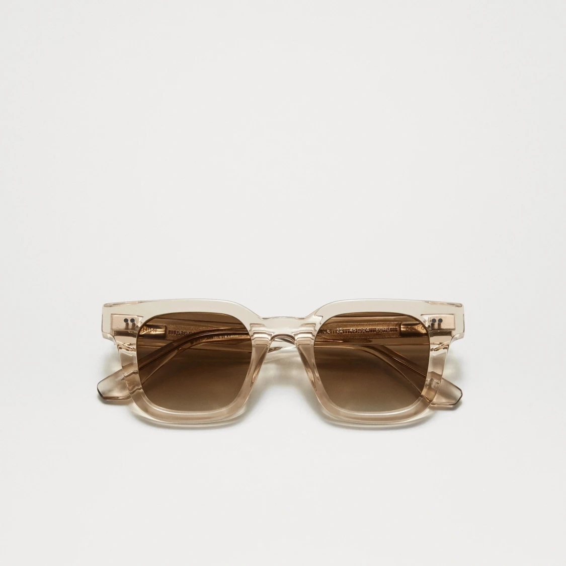 Stilrena solglasögon med transparent beige båge och bruna fyrkantiga glas. Snygg och modern design som passar perfekt till sommaren. Bågarna är i plast och ger en trendig look.