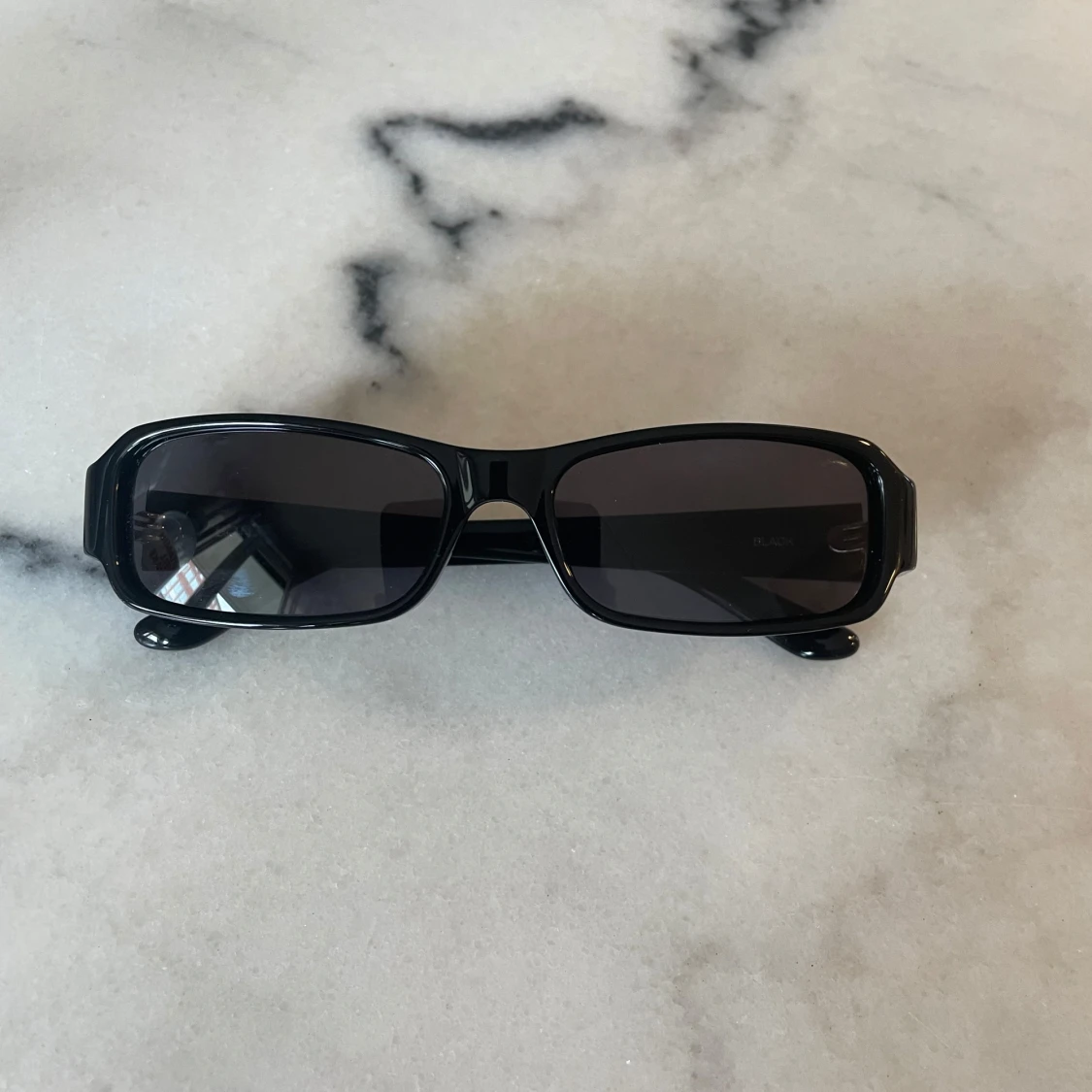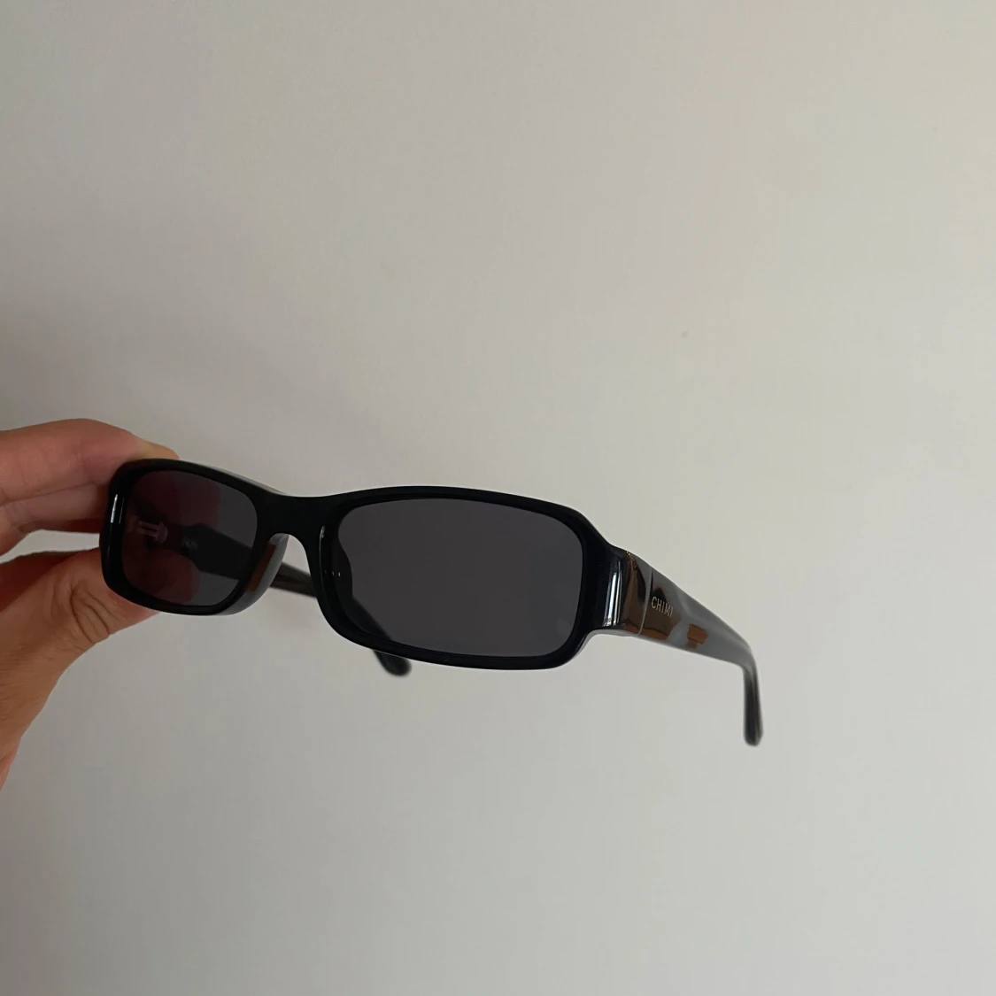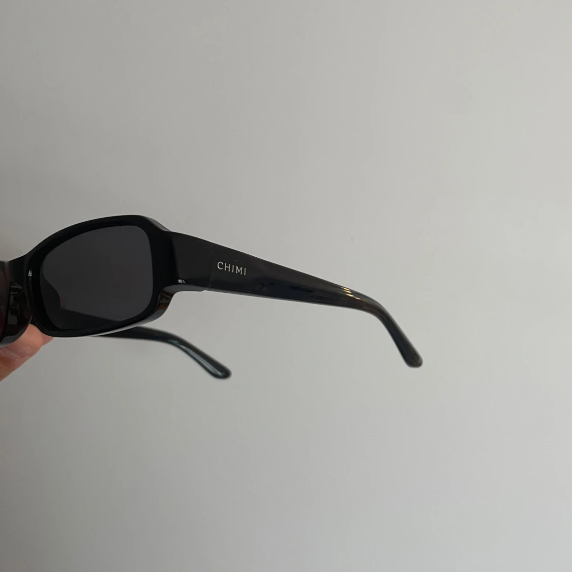 Snygga svarta solglasögon från CHIMI med rektangulära bågar och mörka glas. Glasögonen har en stilren och chunky design med logga på skalmen. De är knappt använda och helt felfria! Nypris: 1600.