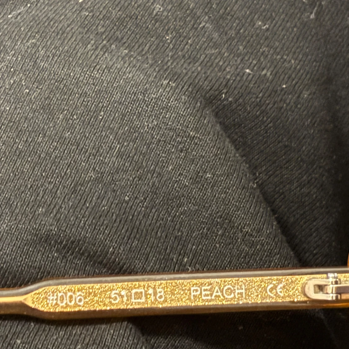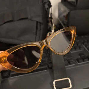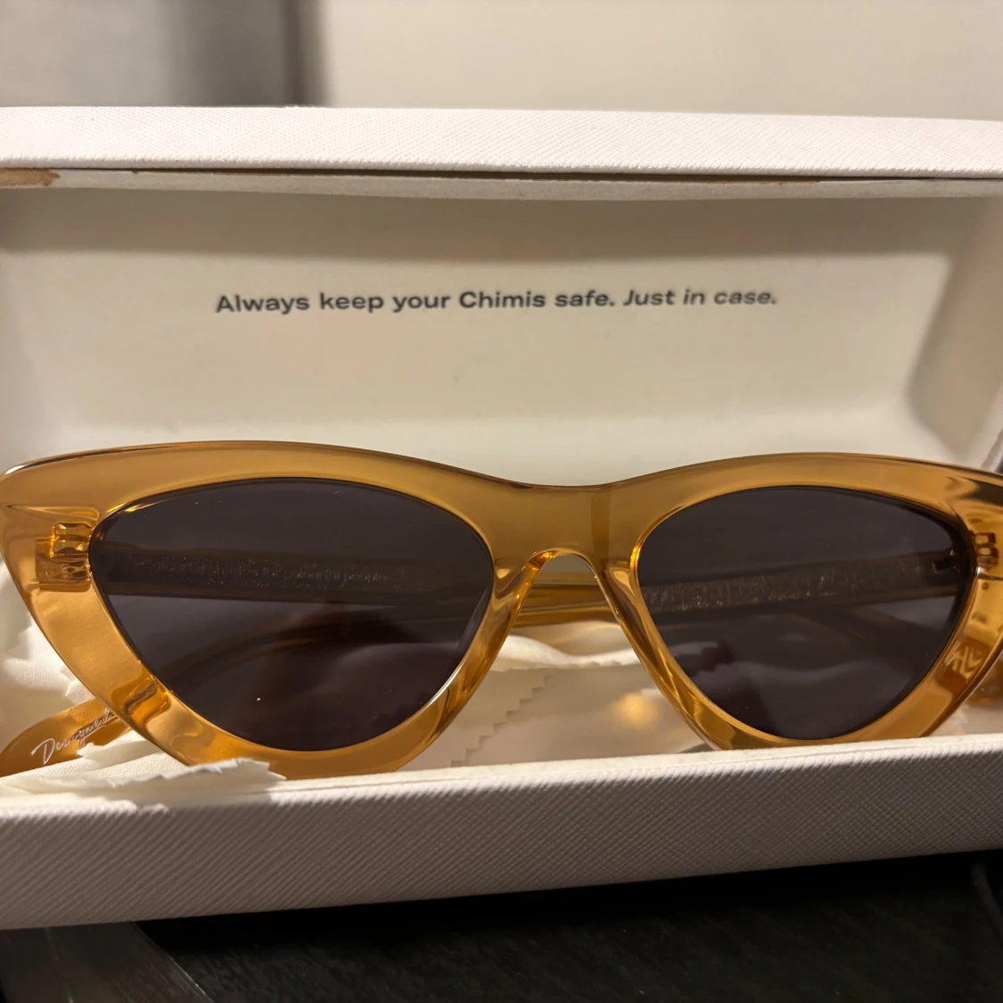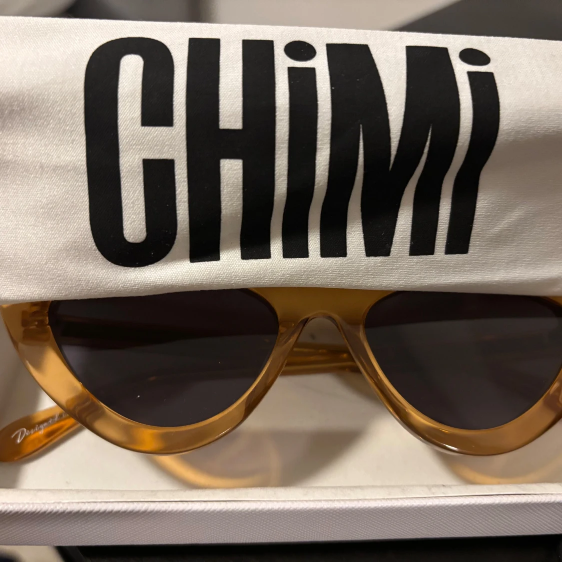 Snygga peachfärgade solglasögon från Chimi med en trendig cat-eye form. Perfekta för att ge din stil en färgklick. Kommer i originalförpackning med skyddande fodral. Liten fläck på insidan av fodralet.