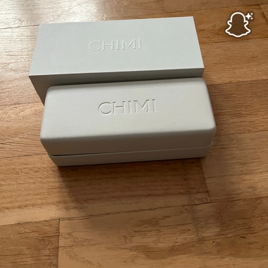 Snygga solglasögon från CHIMI med transparent fyrkantig båge och mörka linser. Kommer med två vita fodral och två vita hårda etuier med CHIMI-logga. Perfekt accessoar för att lyfta din stil och skydda ögonen mot solen.
