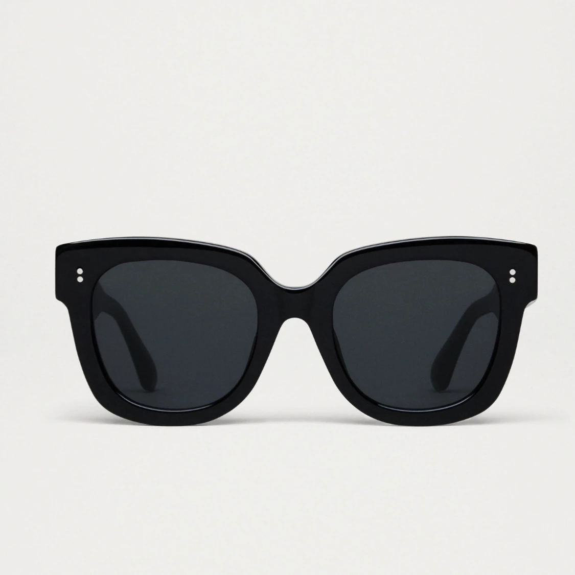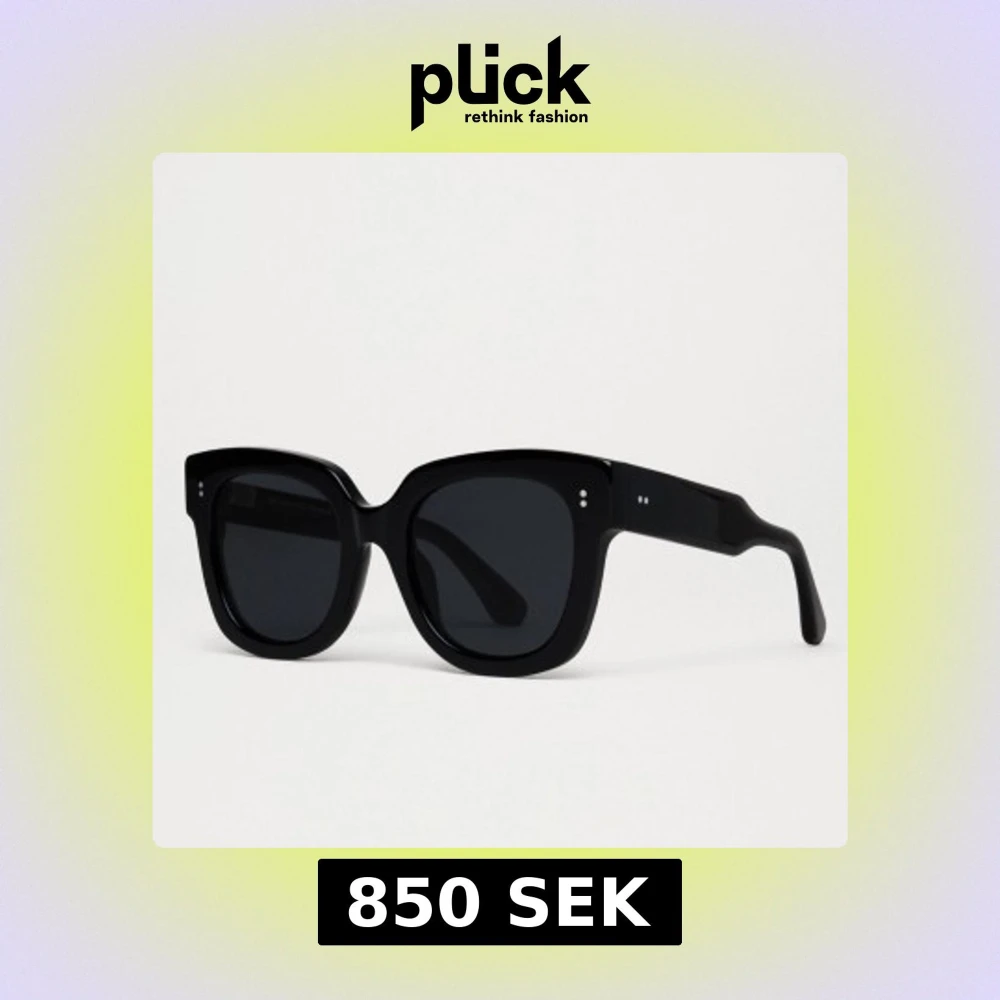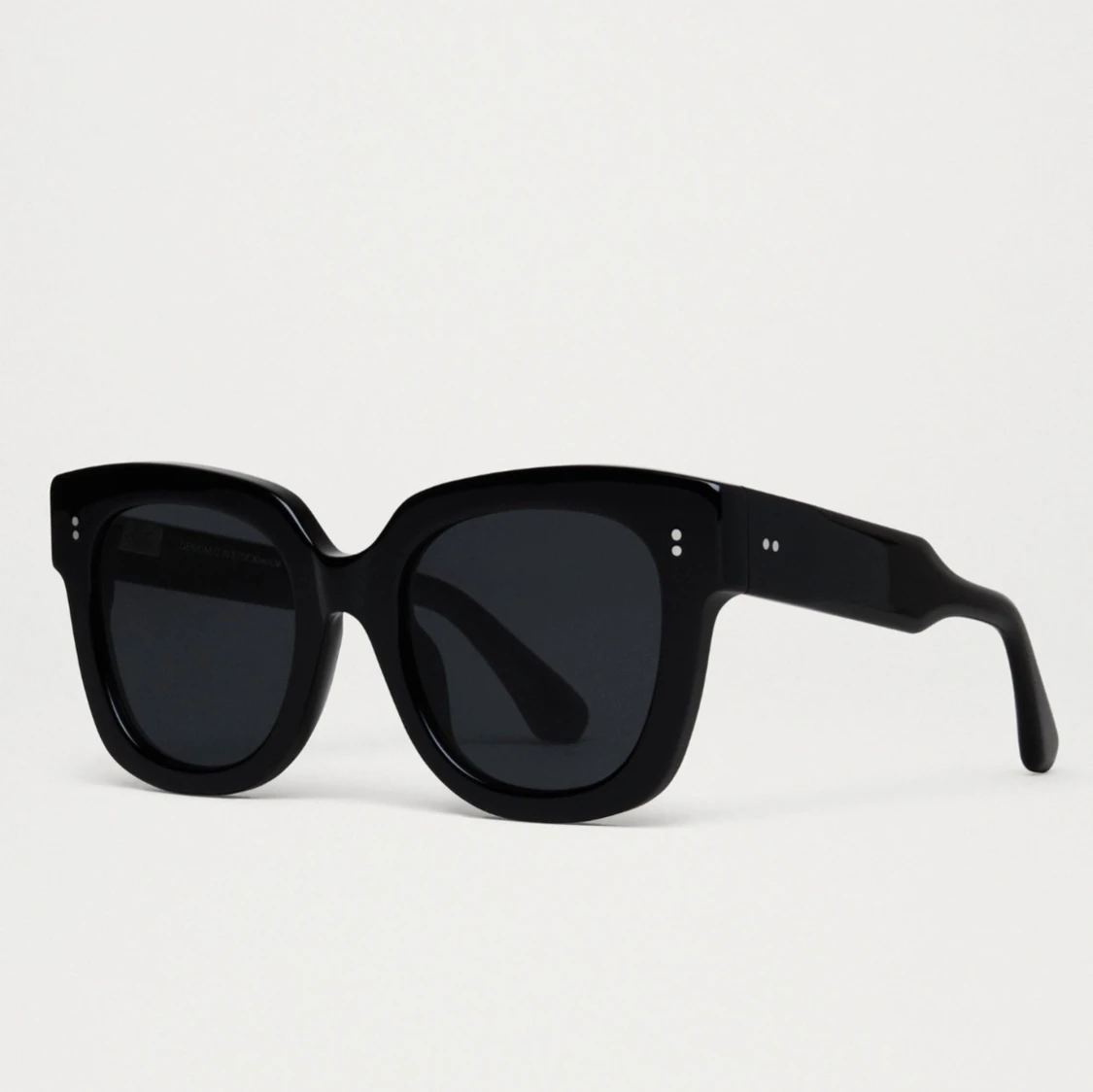 Snygga svarta solglasögon från CHIMI med breda bågar och fyrkantig form. Glasen är mörka och bågarna har en glansig finish med små silverdetaljer vid skruvarna. Kommer med vit CHIMI-fodral. Perfekt för dig som gillar stilrena accessoarer. Dem är nästan helt oanvända.