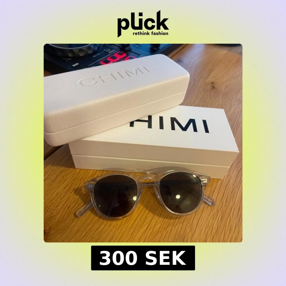 Snygga solglasögon från CHIMI med transparent båge och runda, mörka glas. Perfekta för att lyfta din stil under soliga dagar. Kommer med originaletui och ask.