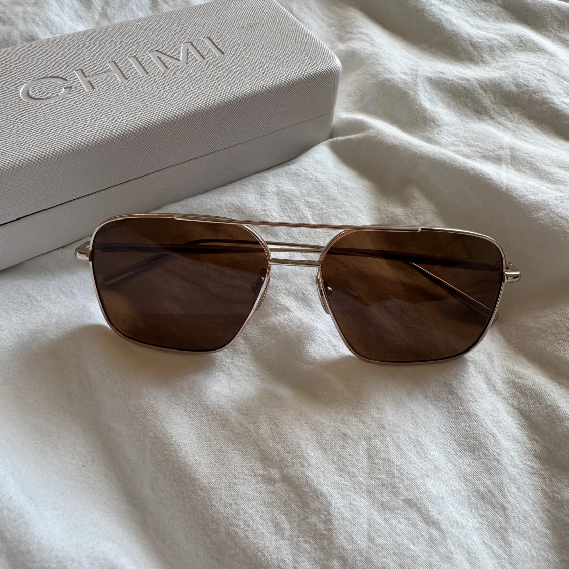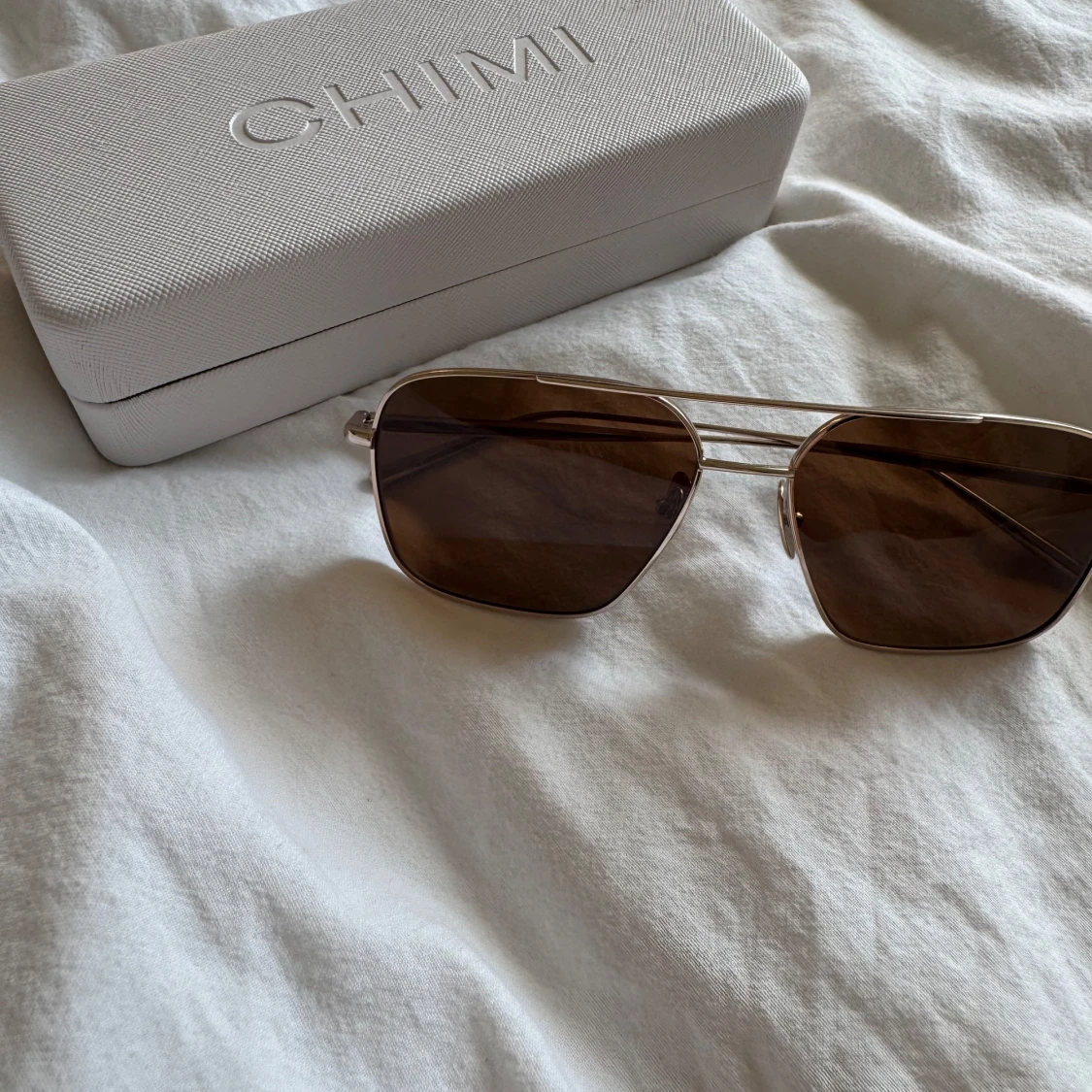 Snygga solglasögon från CHIMI med klassisk pilotform och bruna glas. Tunn metallbåge i guld som ger en stilren och modern look. Perfekta för dig som vill ha en tidlös accessoar med lite attityd.