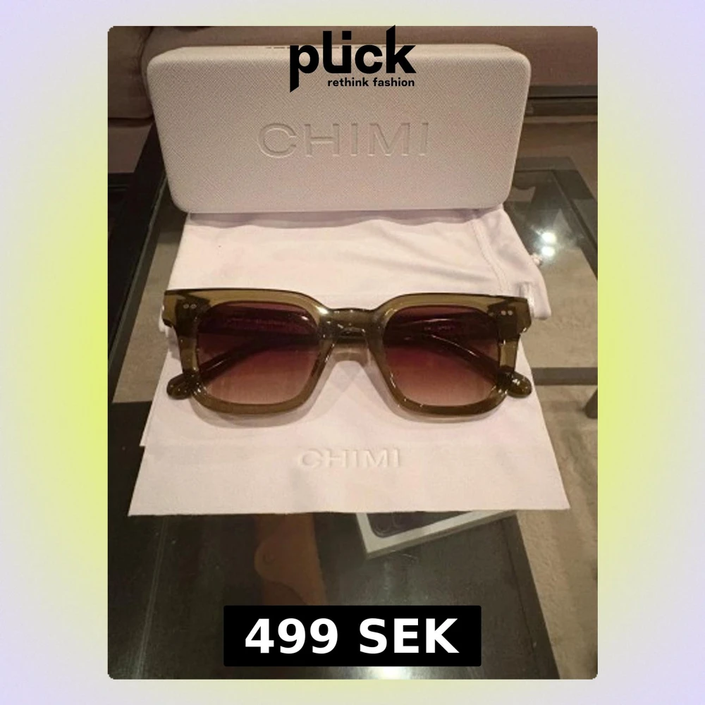 Snygga solglasögon från CHIMI med transparent grönt acetatbåge och fyrkantig form. Glasen är tonade i brunt och ger en fräsch vibe. Kommer med originalväska och putsduk. Vid funderingar är det bara att skriva. Snabb och enkel affär så kan priset diskuteras