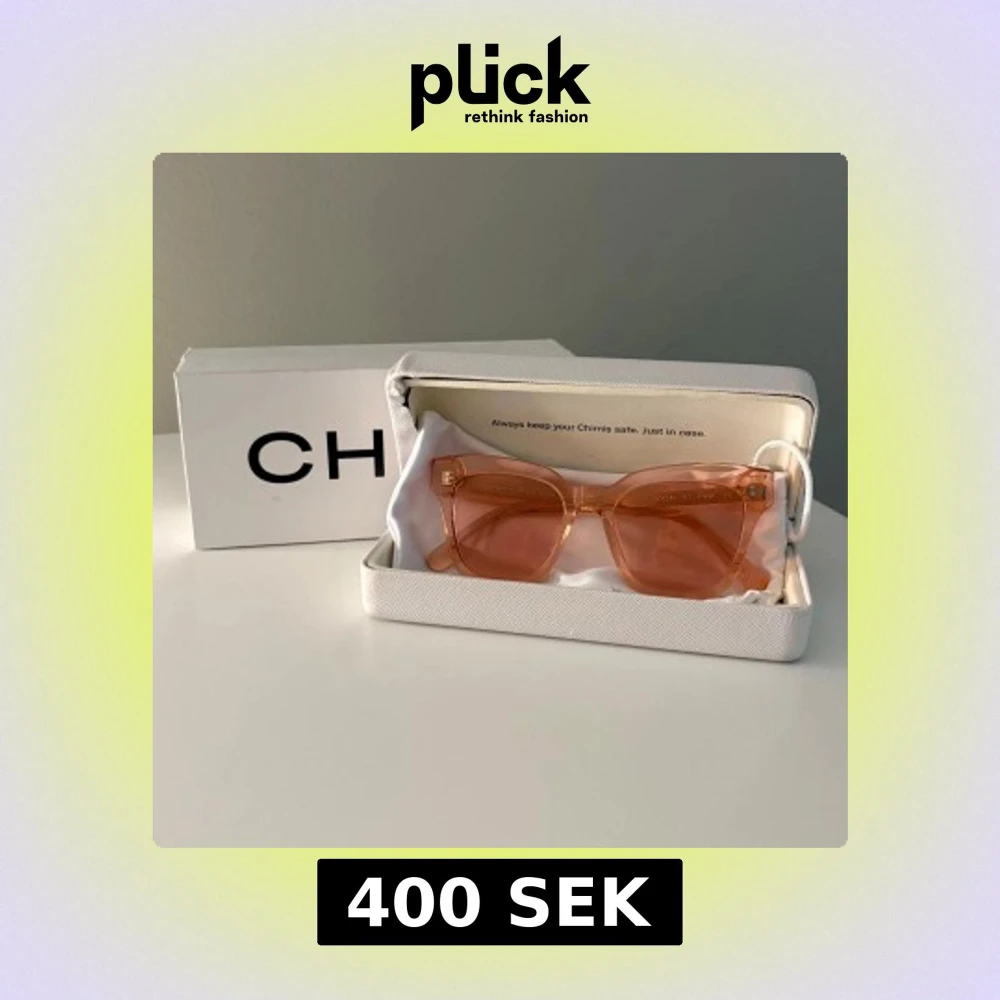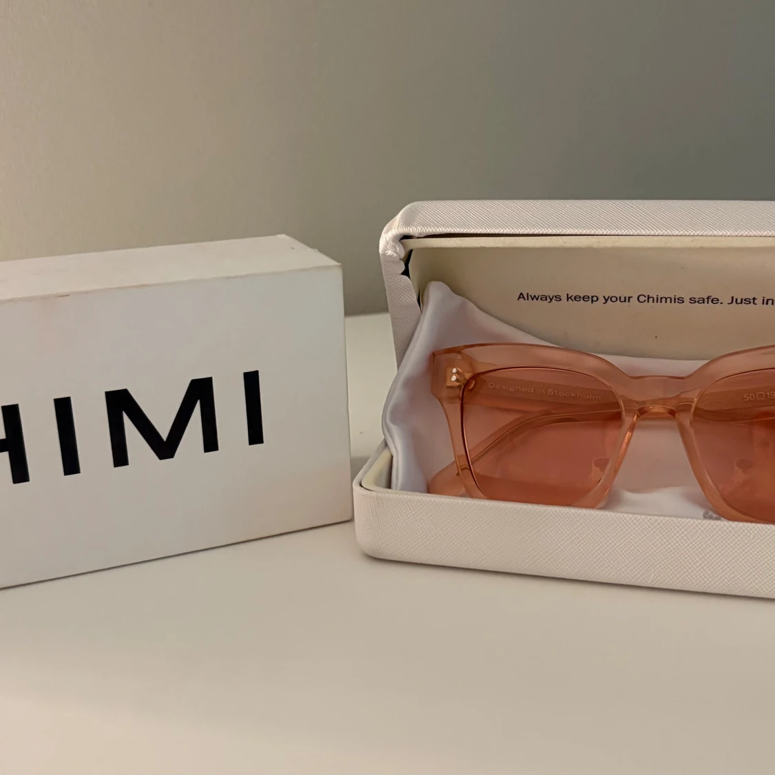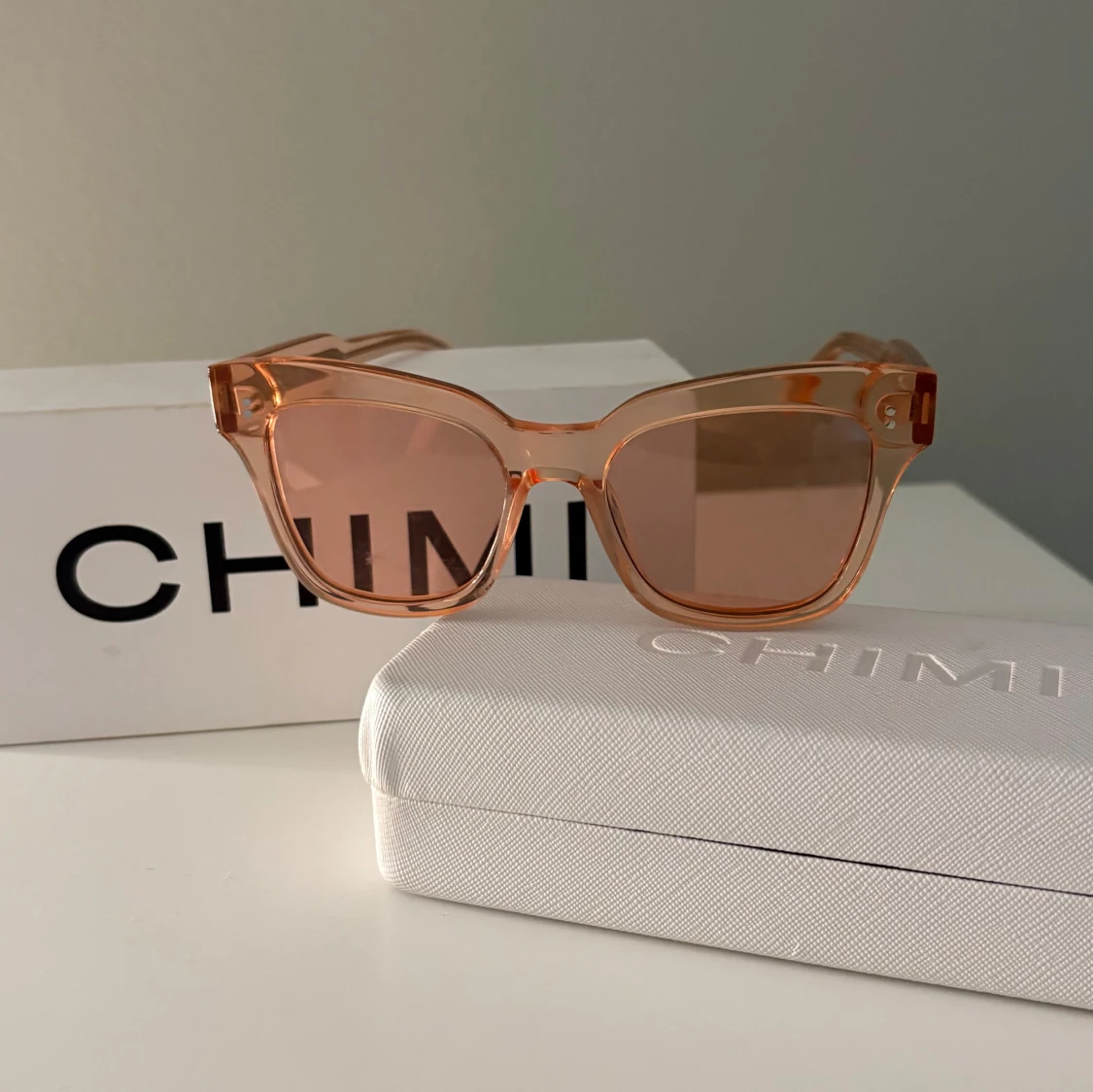 Snygga solglasögon från Chimi i en transparent ljus rosa färg. Modellen 07, ”boxen” är lite skadad.