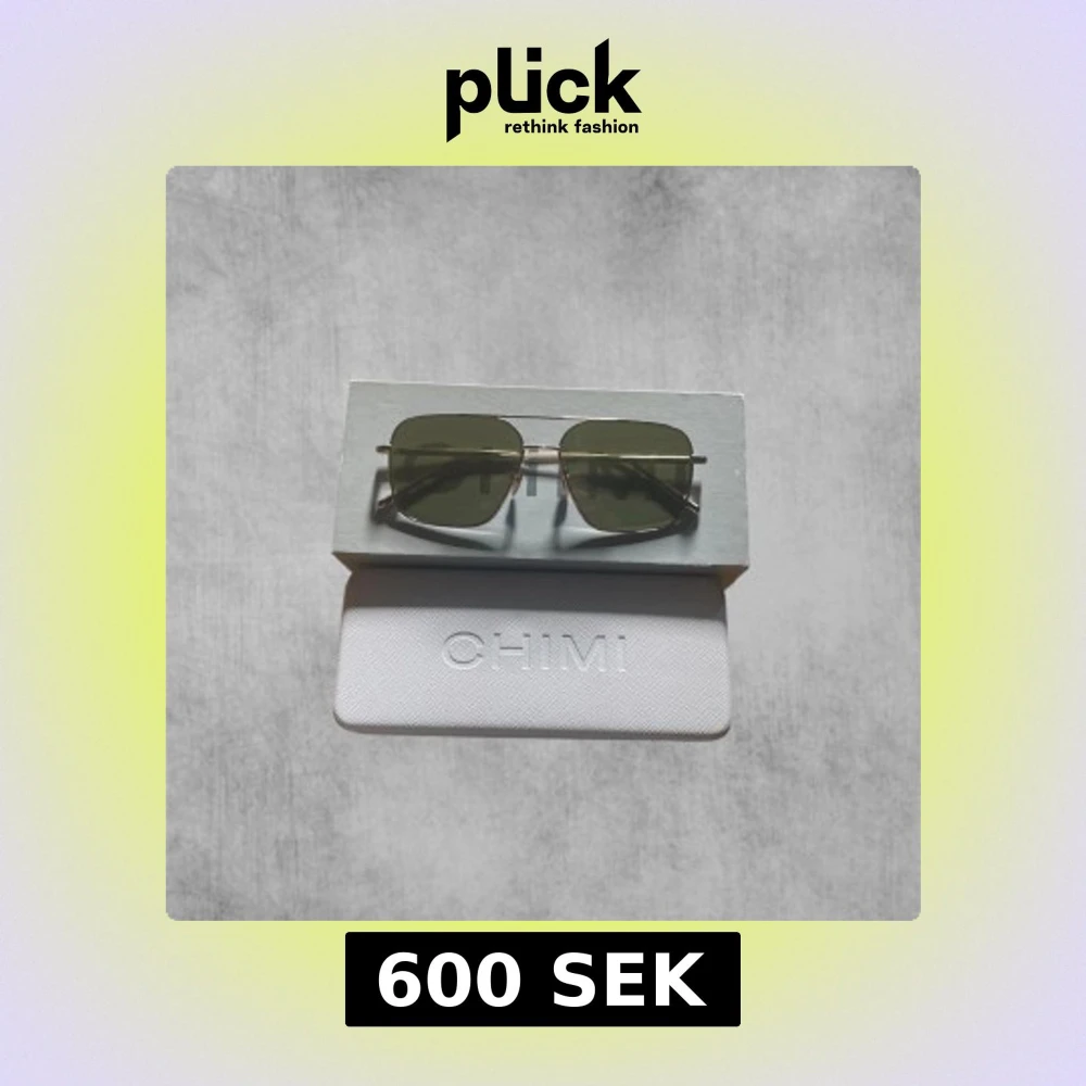 Snygga solglasögon från CHIMI med rektangulära gröna linser och tunn guldfärgad metallbåge. Kommer med originalfodral, box och putsduk. Perfekt accessoar för att lyfta din stil och skydda ögonen mot solen.