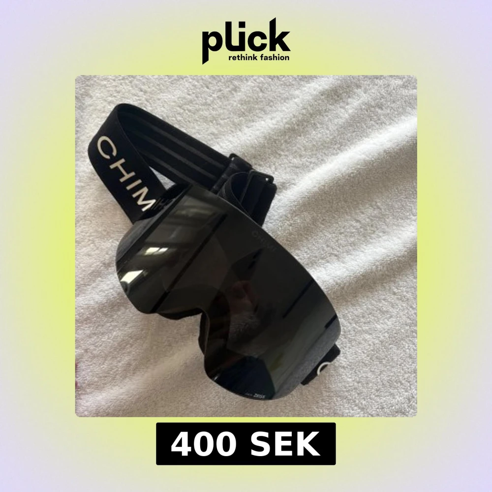 Säljer ett par svarta skidglasögon från CHIMI med Zeiss-lins. De har en bred, mörk och spegelblank lins med minimalistisk design och svart elastiskt band med vit CHIMI-logga. Perfekt för dig som vill ha stilrena goggles i backen. De är använda under två veckor totalt och har inga större tecken på användning. Bra skick! Skriv för fler bilder eller frågor💕