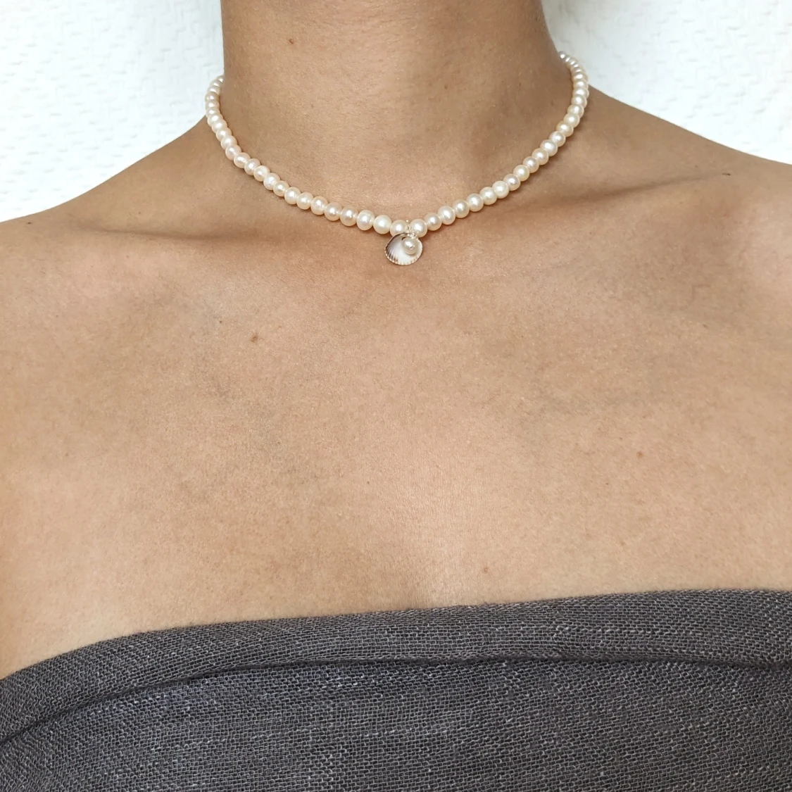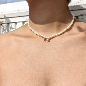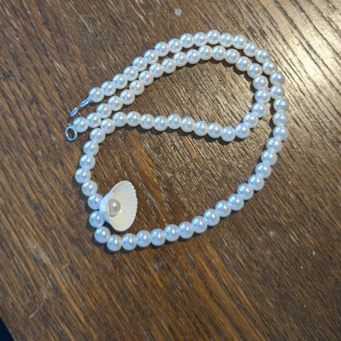 Storlek kan man välja själv. Pärlorna är vita. Det är en elastisk tråd som sätts fast med en s-formad krok