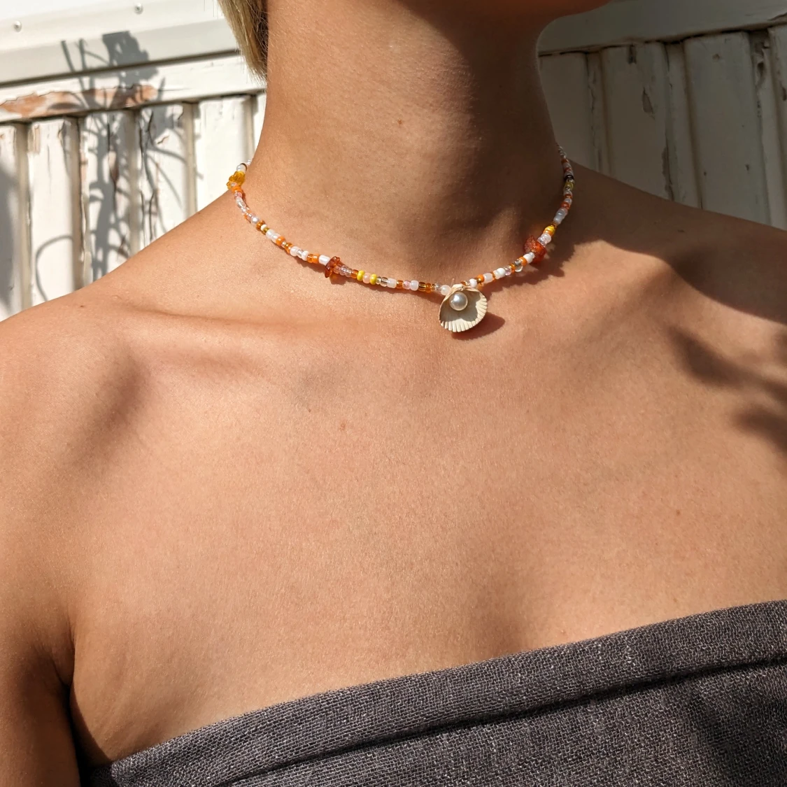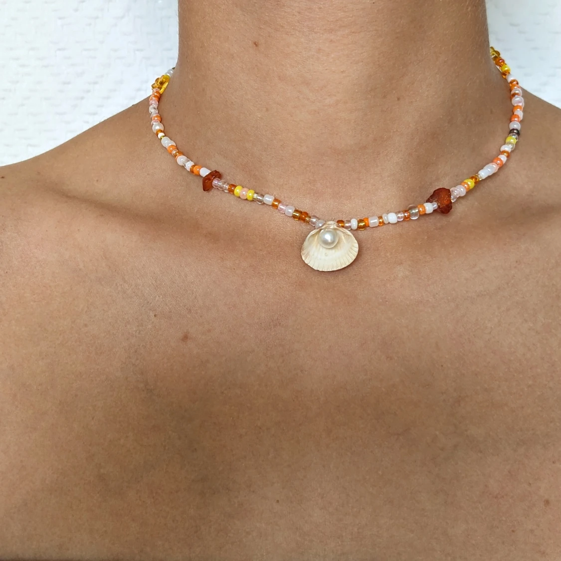 Storlek kan man välja själv. Pärlorna är mixade vita, gula, orangea och genomskinliga. Det är en elastisk tråd som sätts fast med en s-formad krok