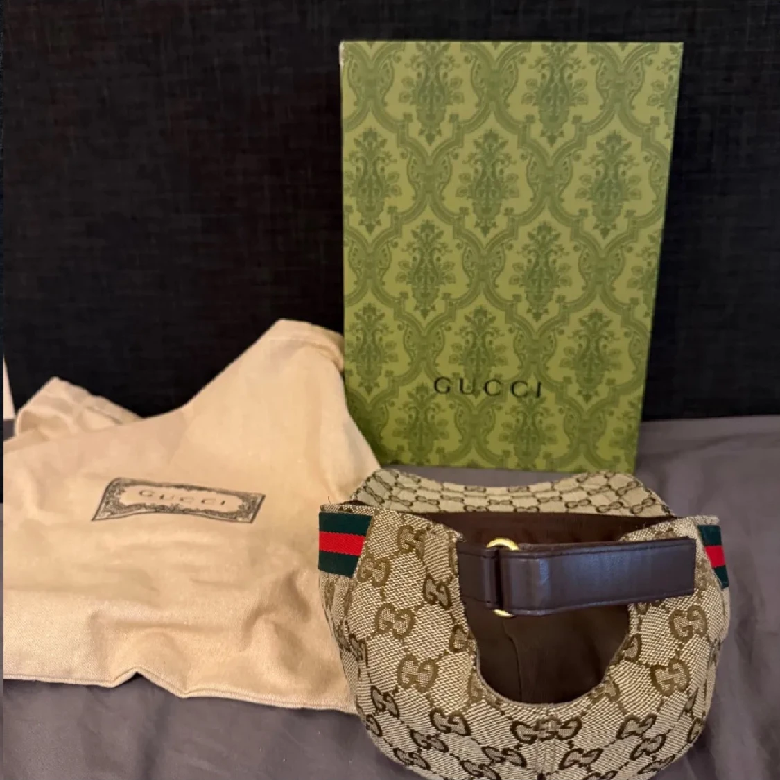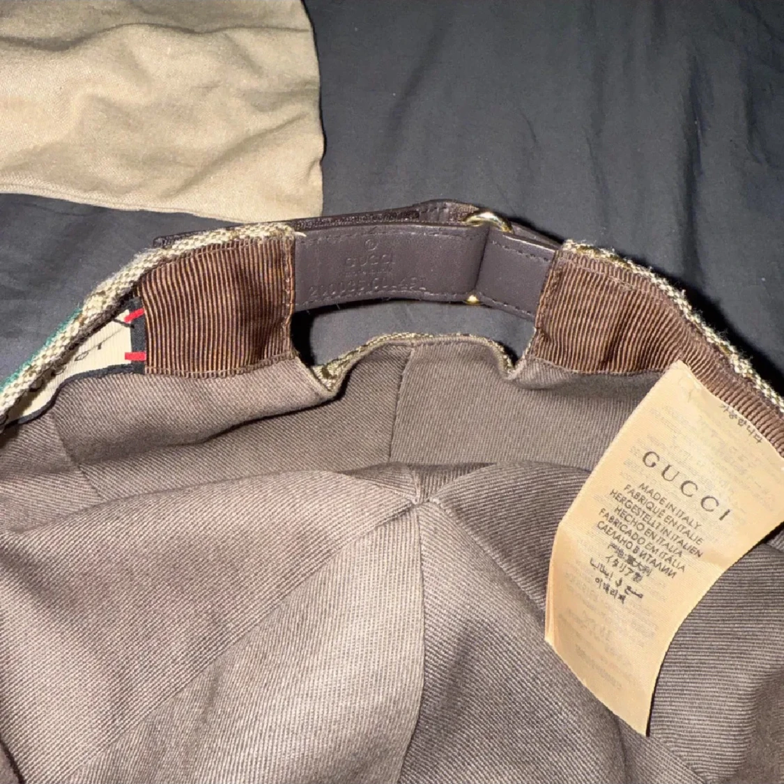 Säljer en klassisk Gucci keps med beige och brunt GG-monogram, gröna och röda ränder på sidan samt justerbart spänne bak i brunt läder. Kepsen är i canvasmaterial och kommer med dustbag och box.