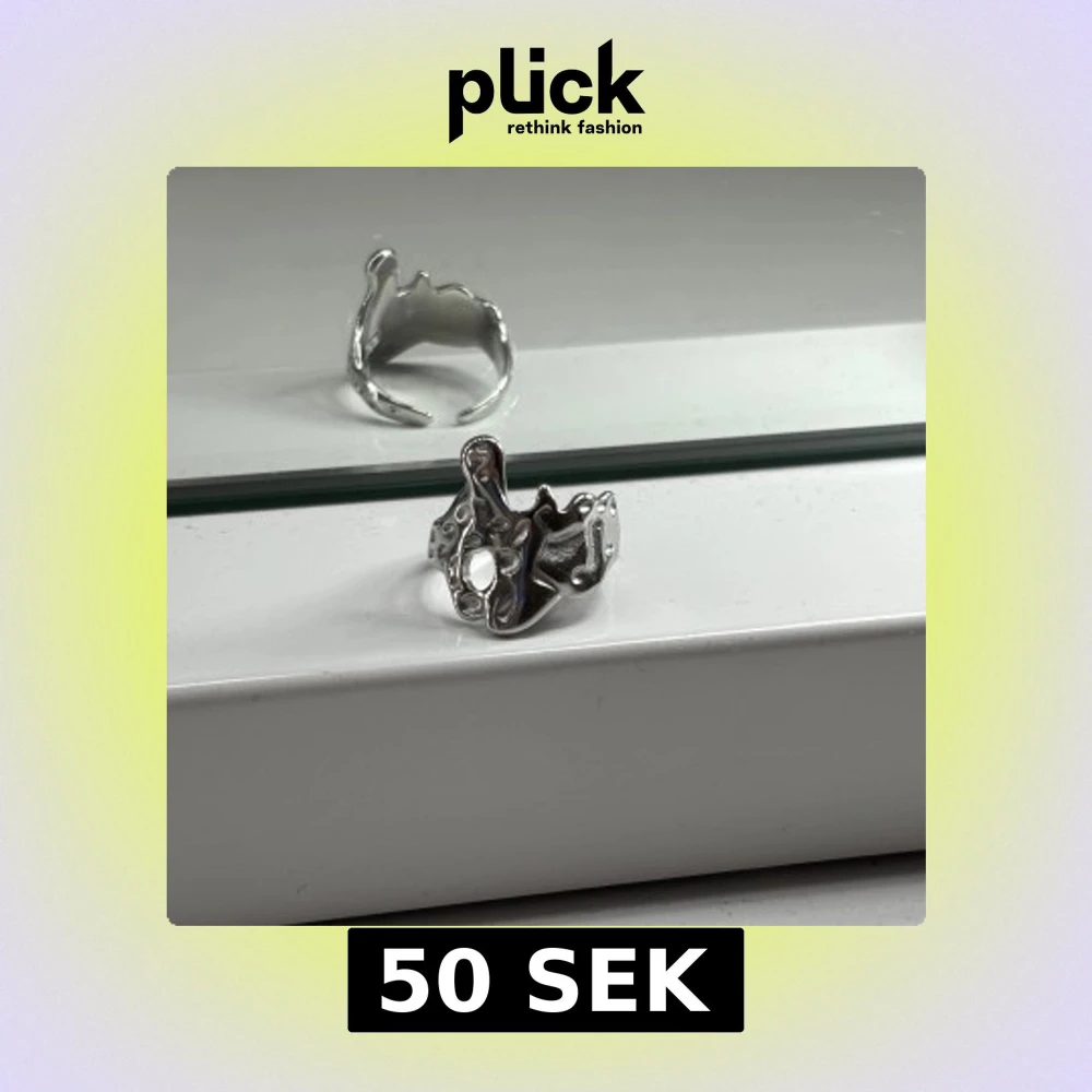 Unik chunky ring i silverfärgad metall med abstrakt, organiskt formad design och öppet avslut. Ringen har en cool, skulptural look med ojämna kanter och håligheter som ger en edgy vibe. Perfekt statement-piece för dig som gillar att sticka ut.