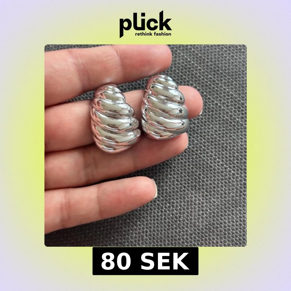 Säljer ett par chunky örhängen i silverfärg med vriden, ribbad design. De är blanka och har en cool, statement look som verkligen syns. Perfekta för dig som gillar att sticka ut med accessoarerna.