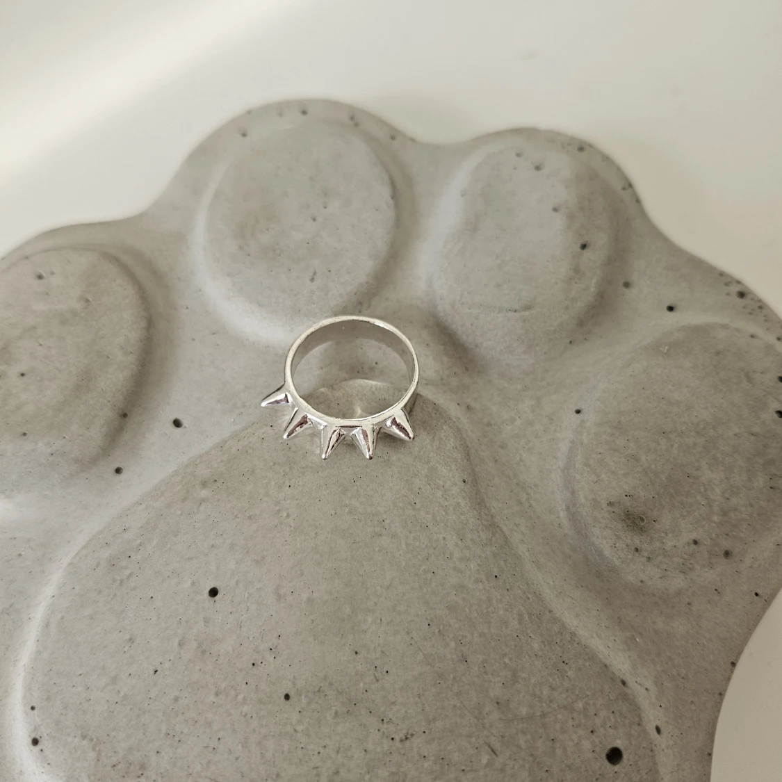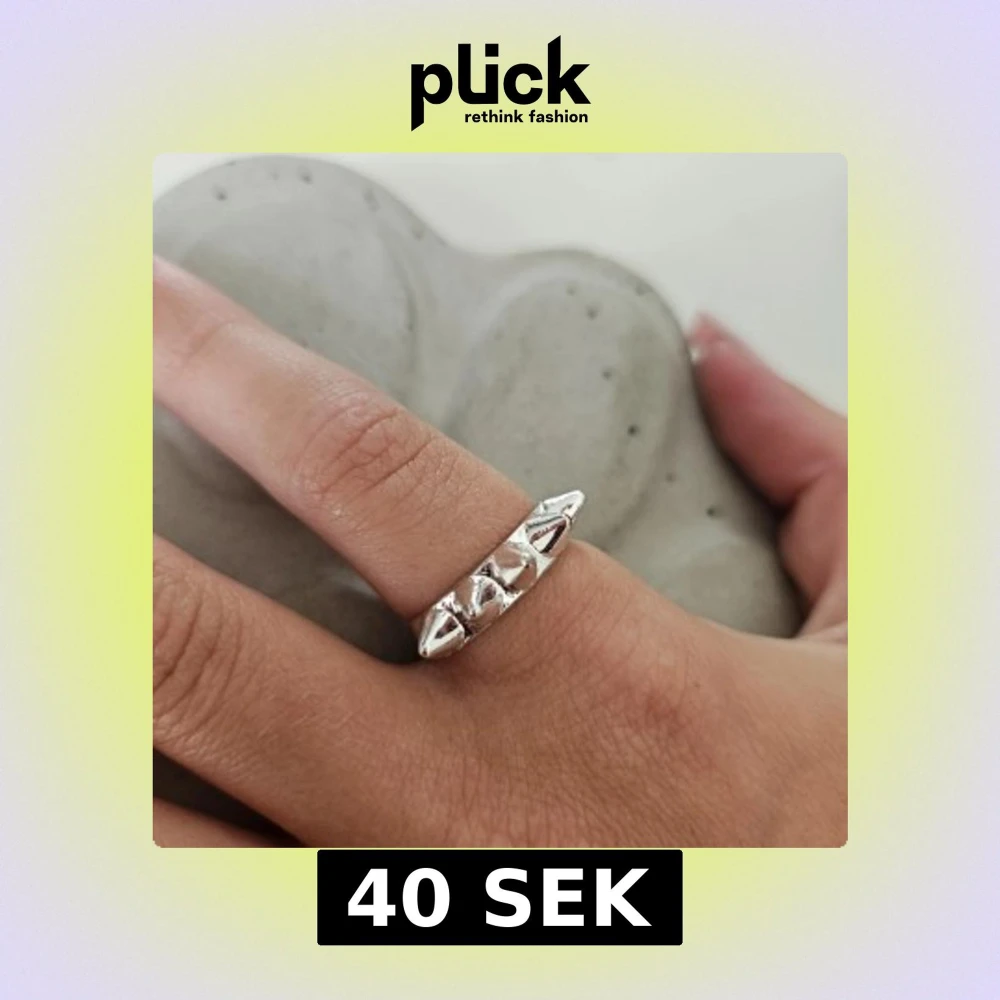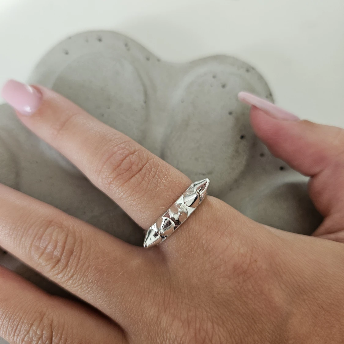 Cool ring i silverfärgad metall med fem spetsiga nitar runt ovansidan. Ringen har en edgy och unik design som sticker ut och passar perfekt för dig som gillar att addera lite attityd till din stil. Säljer denna eftersom den inte kommer till användning