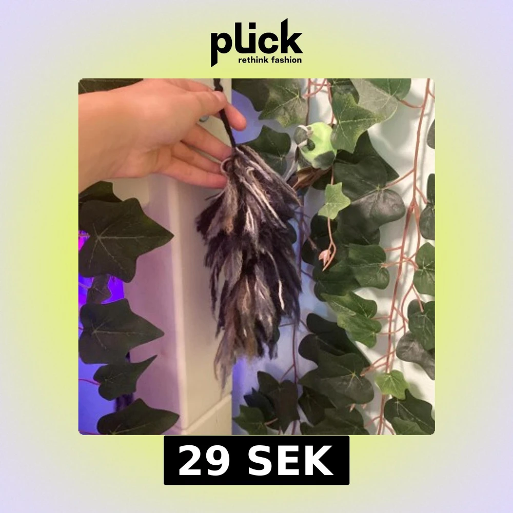 Egengjord svans i svart och grått, ett grönt hänge högst upp medföljer men det går att ta av och byta