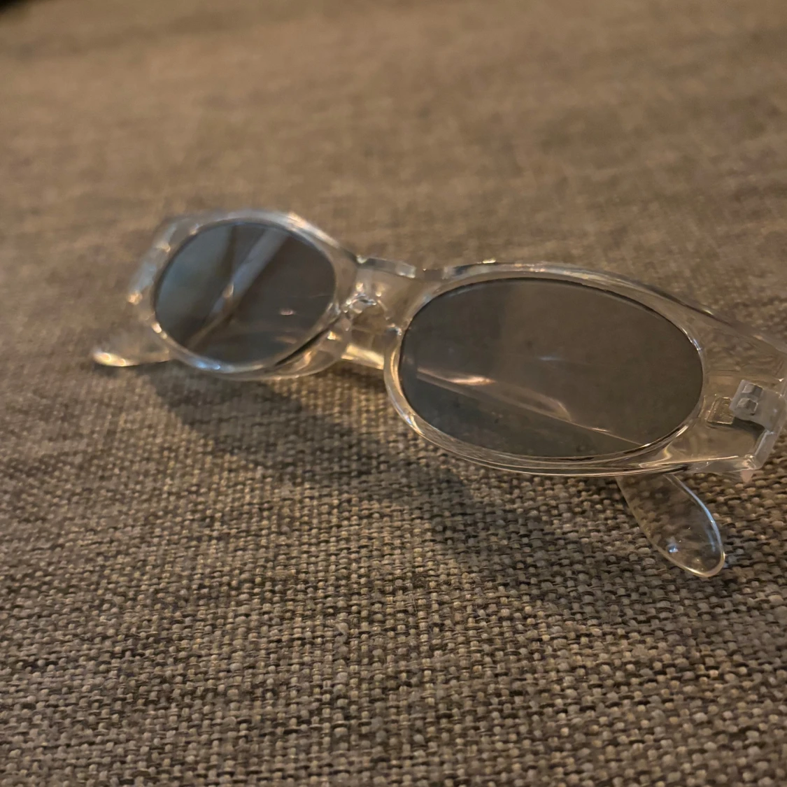 Snygga solglasögon med transparent båge och ovala, mörka glas. Ramen är i plast och ger en modern och clean vibe. Perfekta för dig som vill sticka ut med en stilren accessoar.