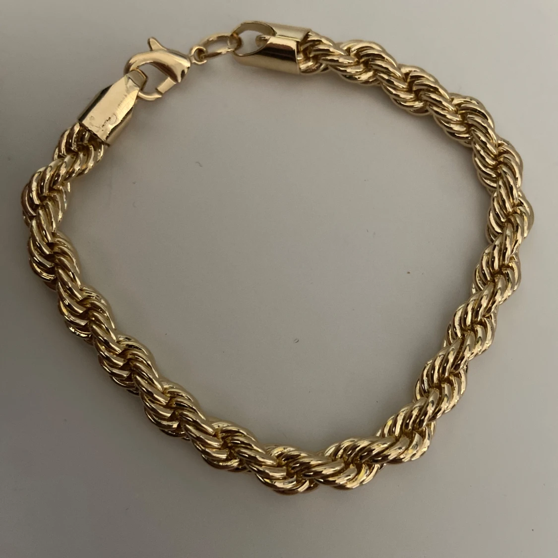 Snyggt armband i guldig färg med tvinnad kedja och klassiskt lås. Perfekt accessoar för att lyfta din outfit med en stilren och trendig touch. Passar både tjejer och killar som gillar stilrena smycken.