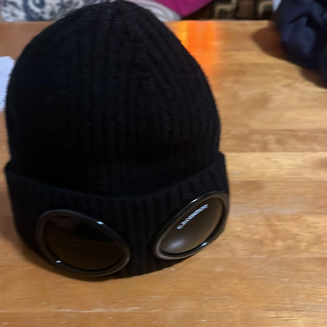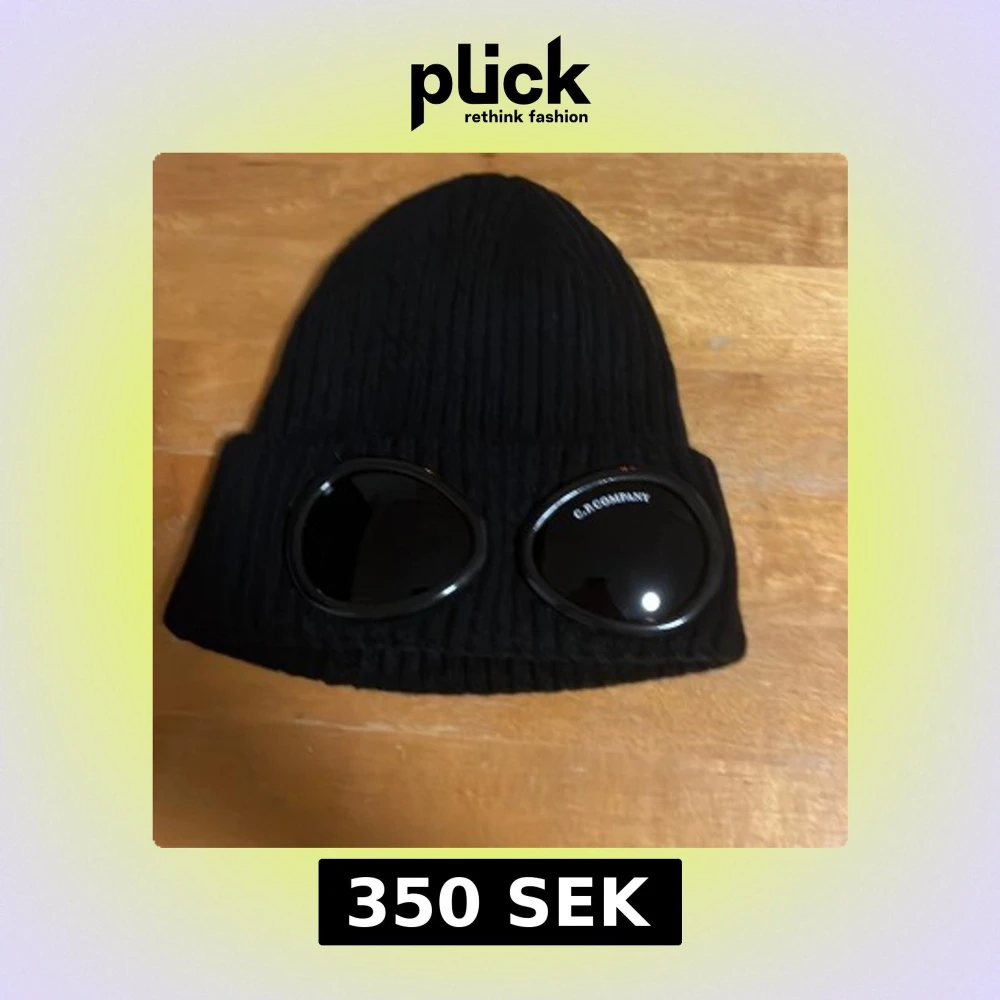 Snygg svart ribbad mössa med inbyggda glasögon från C.P. Company. Perfekt för att ge din outfit en unik touch. Mössan är både stilren och funktionell.