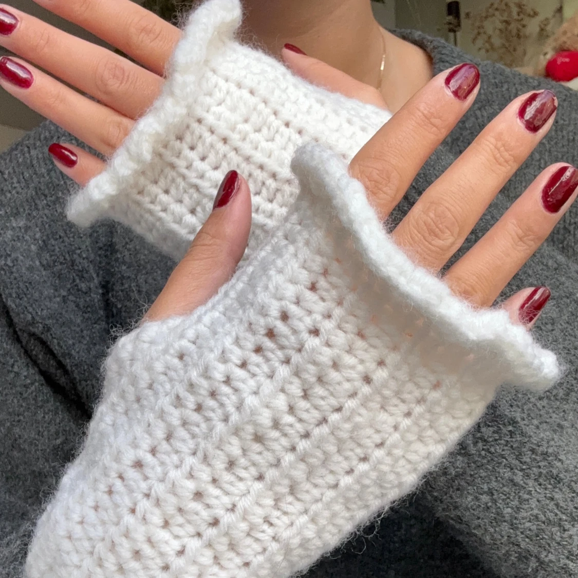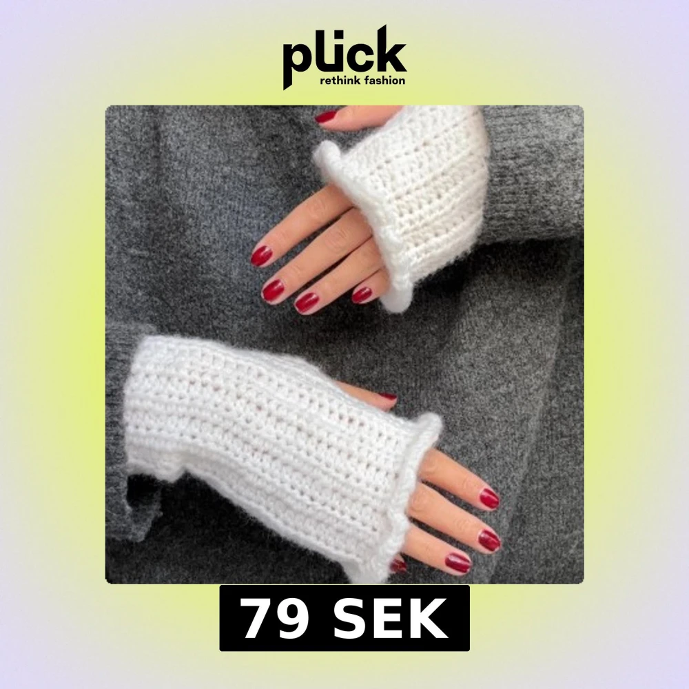 Säljer ett par handgjorda, virkade handledsvärmare i mjukt vitt garn. De är fingerlösa och har en lätt vågig kant vid öppningarna, vilket ger en söt och mysig look. Perfekta för att hålla händerna varma samtidigt som du kan använda mobilen.