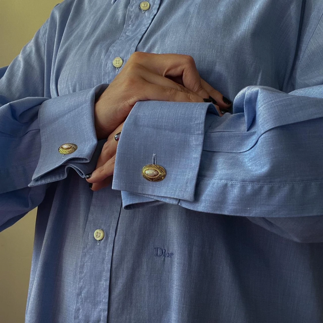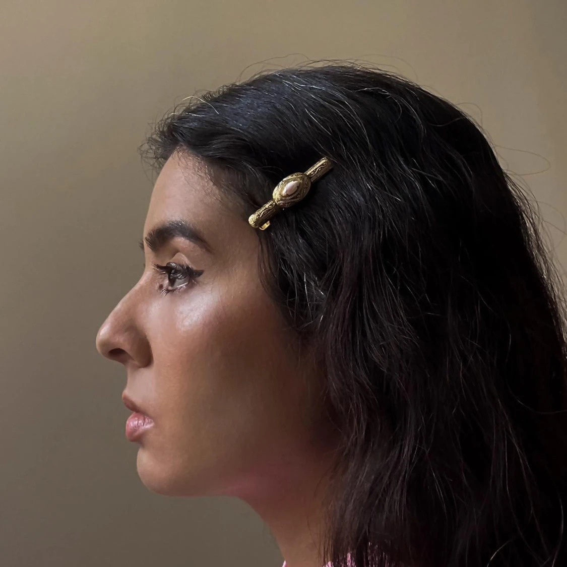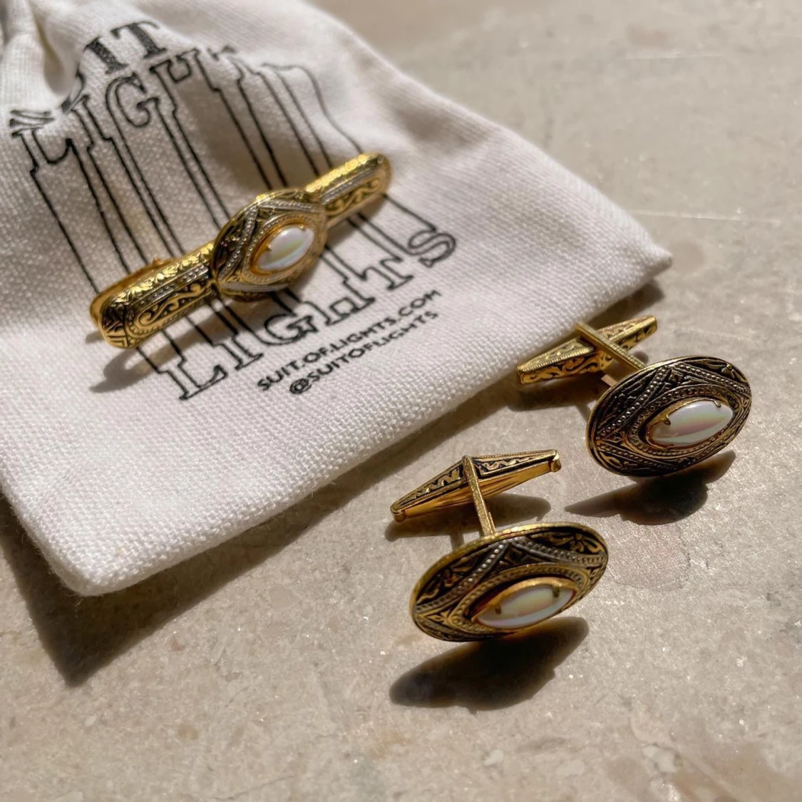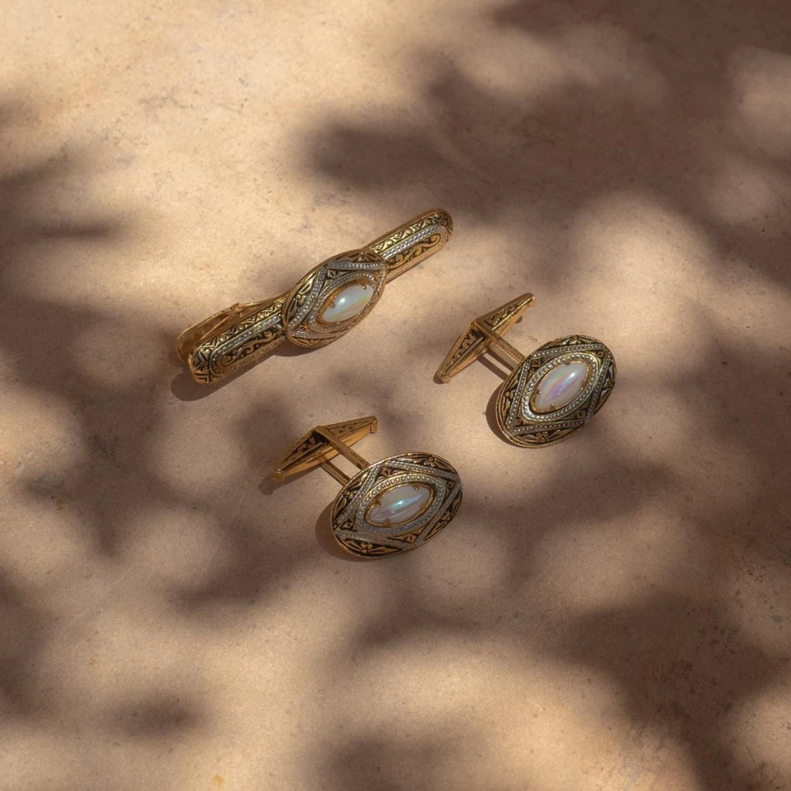 Gorgeous Vintage Set of Matching Cufflinks and Clip Pearlized Bead set in Engraved Brass Metal Gold Color #cufflinks #mermaid #pearl #feminine #edwardian