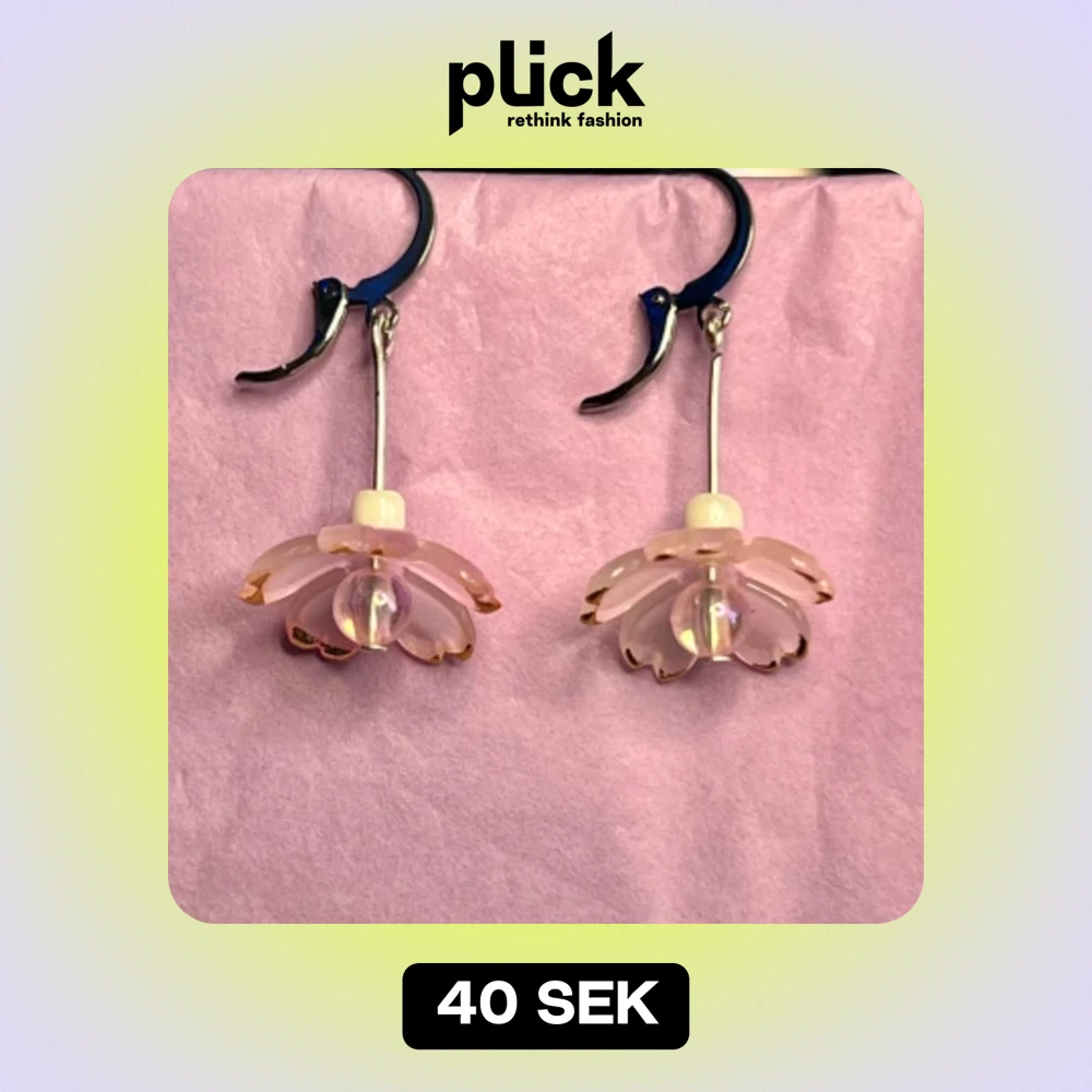 Söta örhĂ€ngen med rosa blommor och vita pĂ€rlor. Gjorda av mig, i rostfritt stĂ„lđžđ€