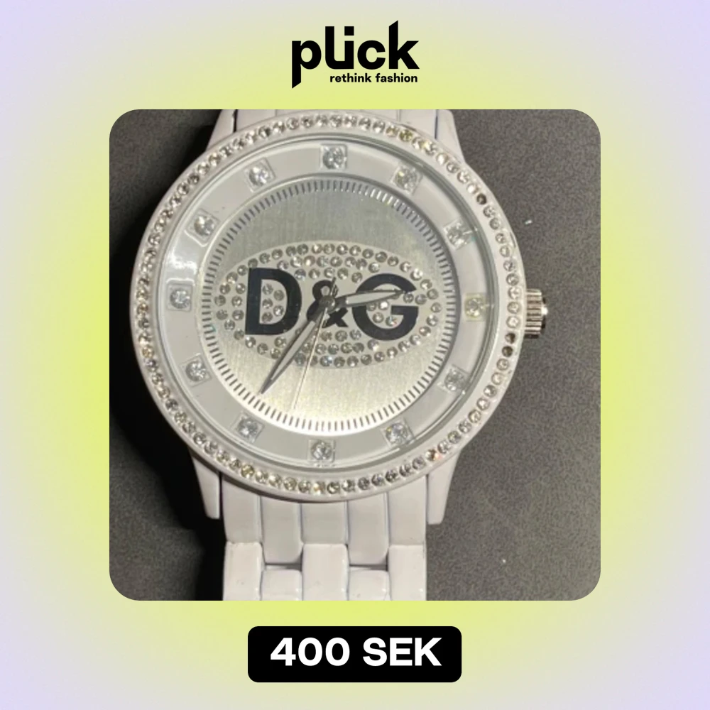 Säljer en snygg vit klocka från Dolce & Gabbana. Den har en glittrig urtavla med D&G-loggan i mitten och är omgiven av gnistrande stenar. Klockan har en vit länkarmband och en silverfärgad krona med D&G ingraverat. Perfekt för att lysa upp vilken outfit som helst!