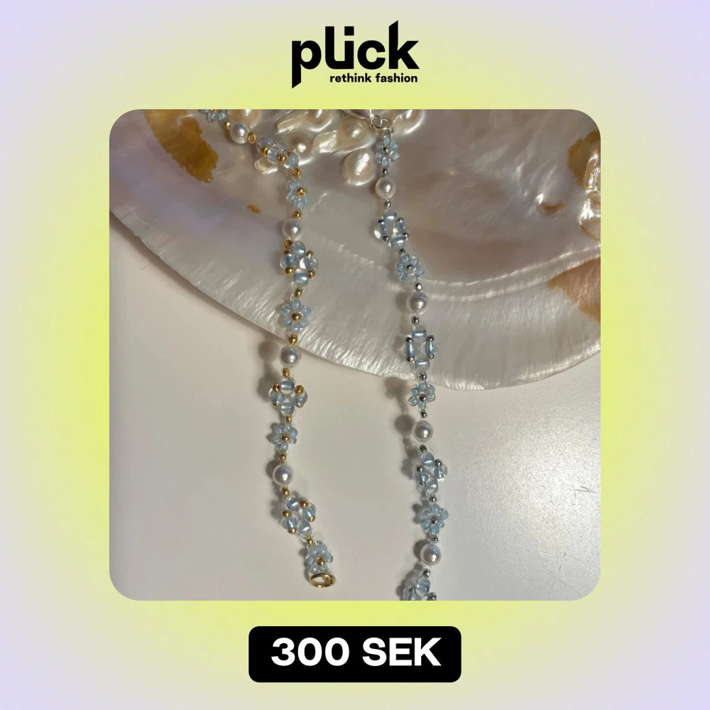 Pearl bracelet with blue flowers and white pearls. Available in fold and silver đ©”