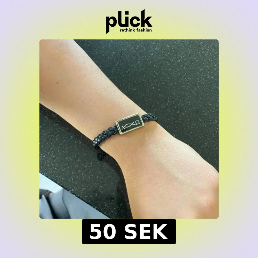 Snyggt svart flätat armband med en rektangulär silverfärgad platta med symboler och fiskmotiv. Armbandet har ett stilrent magnetlås i metall och passar perfekt som accessoar till vardagslooken. Symbolen säger: Alpha Fisk Omega🙌🏼🖤➰