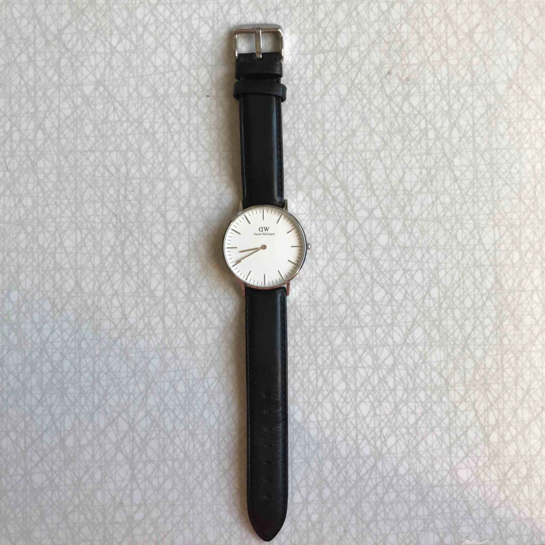 Klassisk, silvrig Daniel Wellington klocka med svart läder i nyskick. Inte min stil så säljer den till någon som skulle ha användning av den. Nypris på denna klocka är 1699kr!
