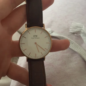 Roséguldig Daniel Wellington klocka med brunt läderband samt ett blått-vitt-rosa band medföljes :) kartongen är borttappad dock. Frakten kan jag stå för, om du inte kan mötas i Karlstad. Kronan på klockan är borta, men det syns inte speciellt mycket. Läderbandet är lite slitet, men inget man egentligen tänker på, samt två revor i glaset som är knappt synbara :)