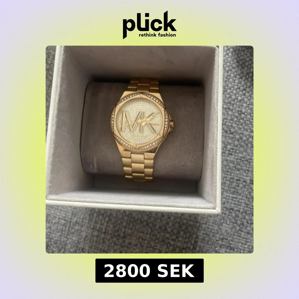 Säljer en snygg guldig Michael Kors klocka med bred länk och stort MK-logo på urtavlan. Urtavlan är dekorerad med glittrande stenar runt kanten och har en lyxig känsla. Kommer i original ask med Michael Kors logga. Perfekt för dig som gillar bling och statement-accessoarer.