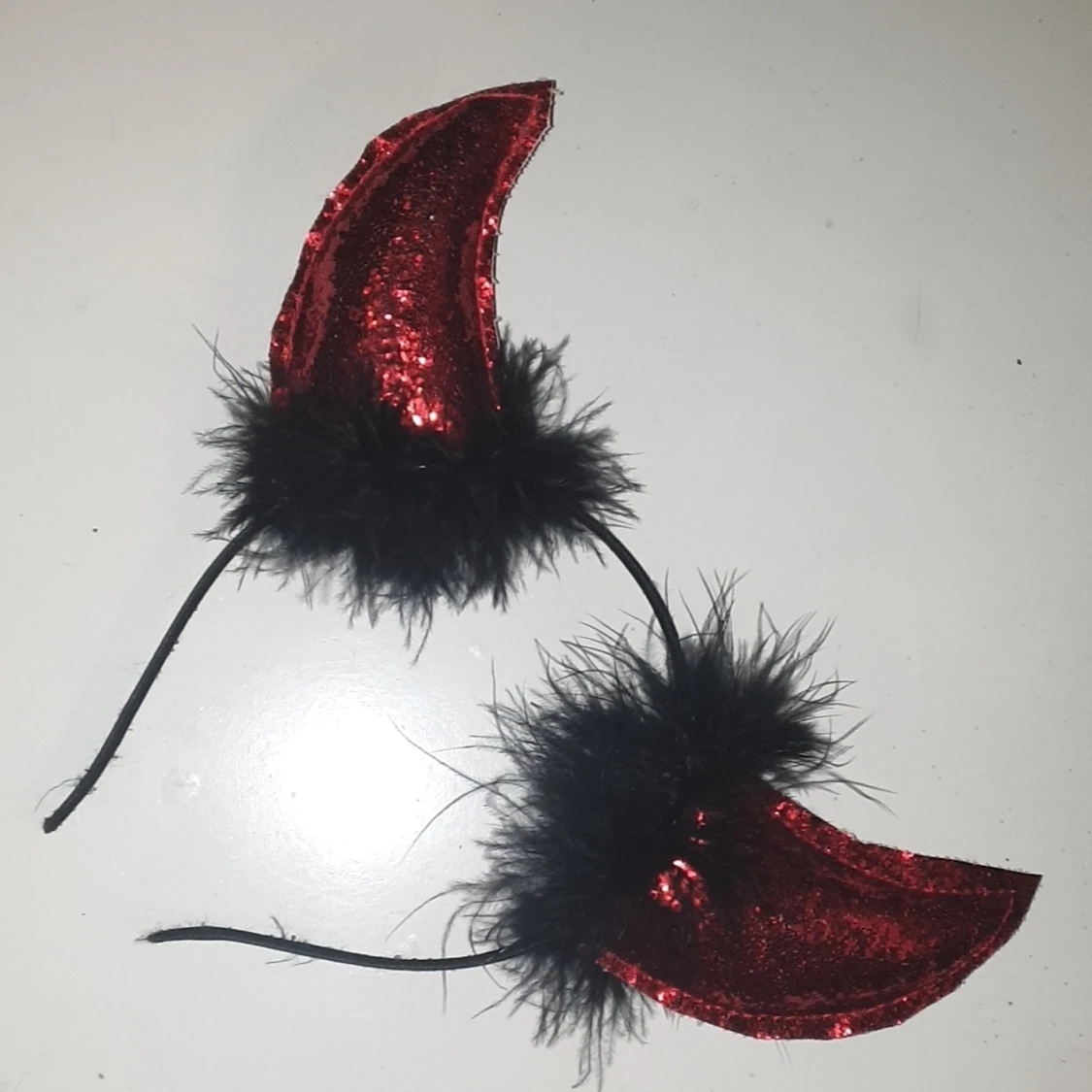 Djävuls horn perfekt till halloween, anvönda 1 gång o nyskick, rödglittriga med svart fluff, obs intressekoll