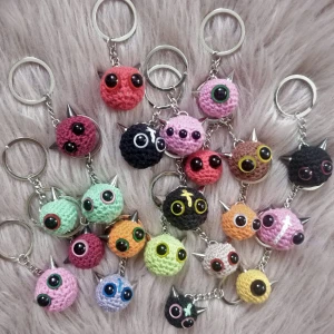 Handgjorda virkade nyckelringar. Kommer i olika fĂ€rgkombinationer, med ett eller tvĂ„ ögon, mörka eller ljusa horn, med eller utan kors. Alla pĂ„ bilden Ă€r till salu men kan ocksĂ„ virka andra kombinationer pĂ„ bestĂ€llning đ Skriv för ej spĂ„rbar fri fraktâš