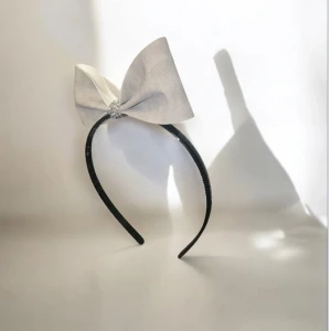 Elegant diadem med en stor grå rosett och en glittrande pärldetalj i mitten. Perfekt för att ge en stilfull touch till din outfit.