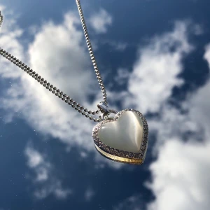 Vacker silvrig hjärt halsband med diamanter runt om🤩💫 Stilit att ha på sig med vilken outfit som helst✨👍🏻 bild två visar storleken jämfört med 5 krona. HELT NY OCH OANVÄND💫✨ frakt tillkommer på 11kr🤩