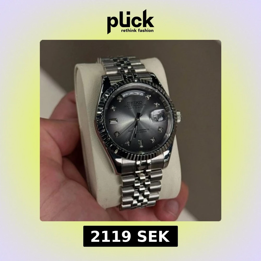 Stilren Seikmod Day-Date klocka med grå urtavla, silverfärgat armband i rostfritt stål och markerade index med stenar. Klockan har dag- och datumvisning samt räfflad bezel. Perfekt accessoar för dig som gillar klassisk och lyxig stil.