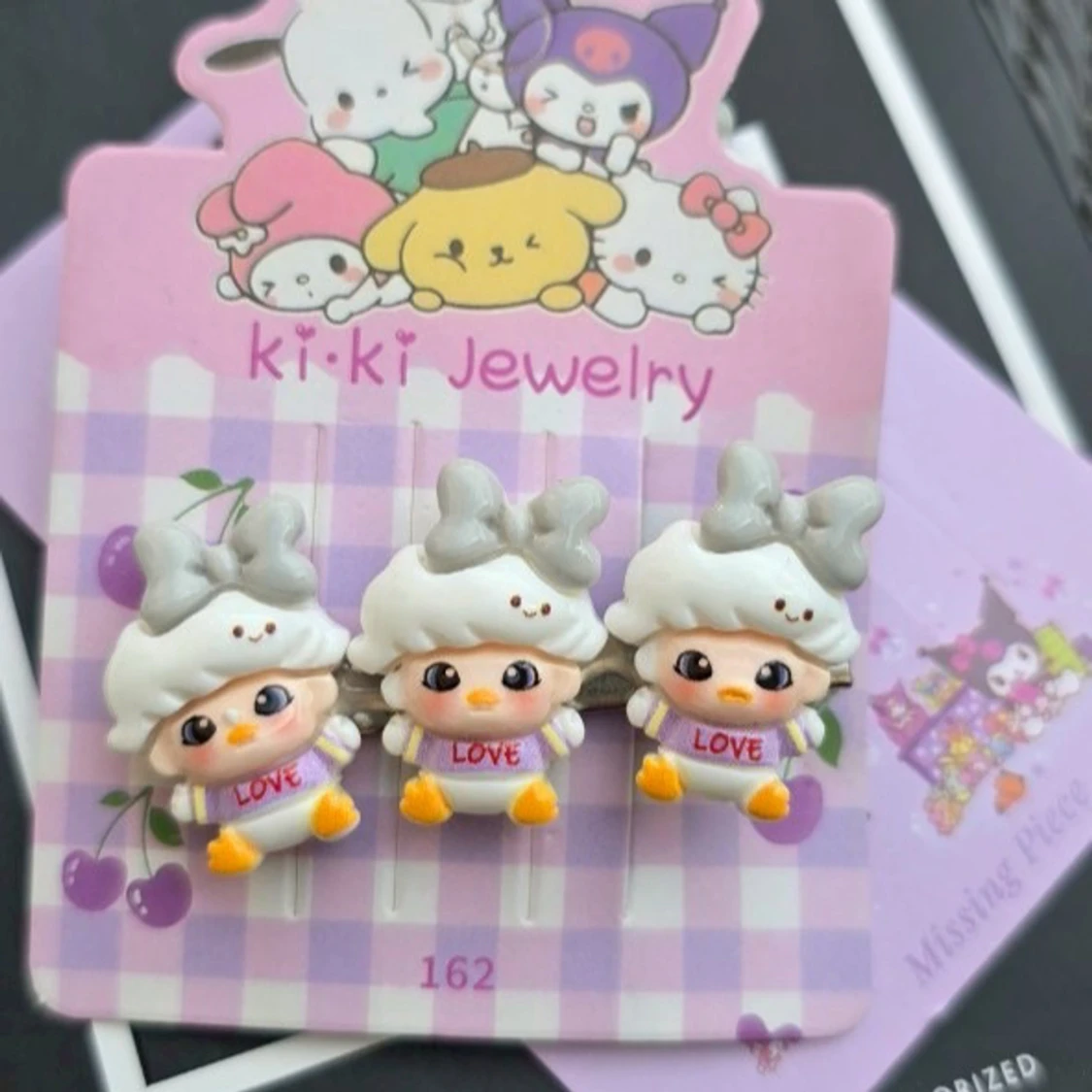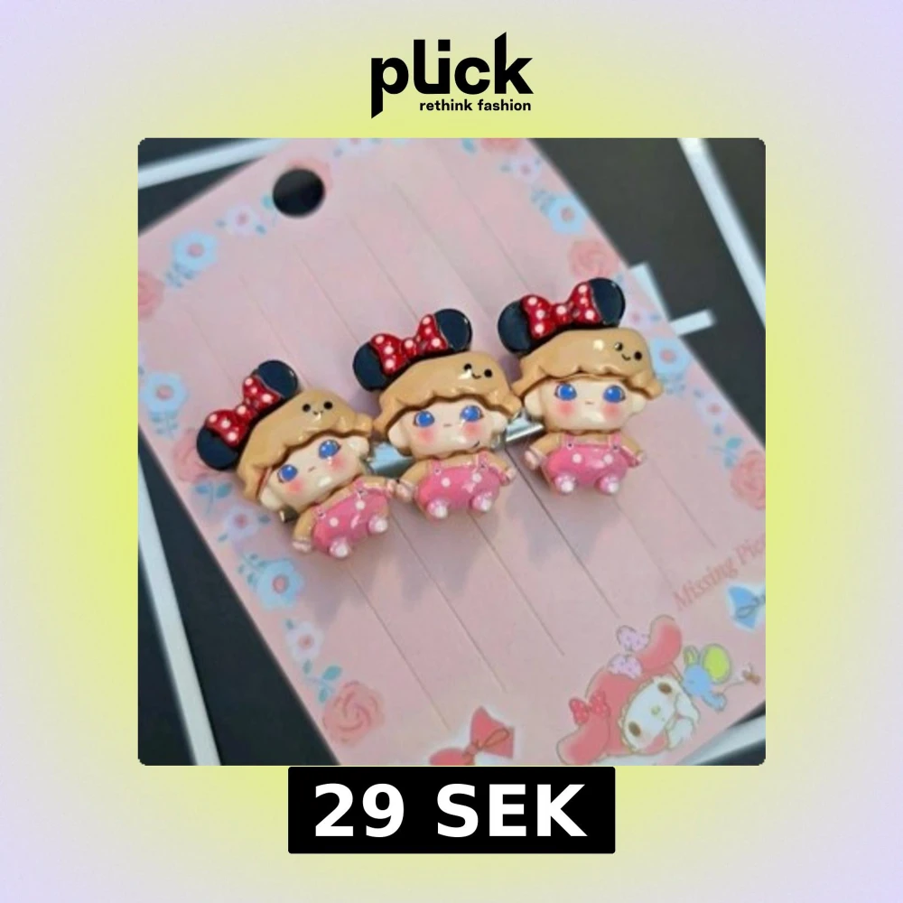 Supergulliga hårspännen i form av 3 små tecknade figurer, bland annat katter, kaniner och dockor. Färgerna är blandade med rosa, blått, vitt och gult. Perfekta för dig som älskar kawaii-stil och vill ha något lekfullt och unikt i håret! Säljs 29kr/st