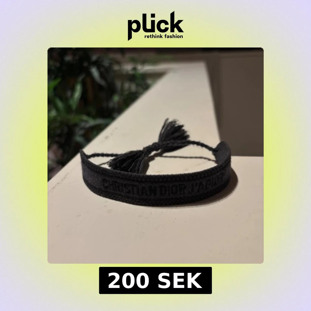 Ett svart tygarmband från Christian Dior med texten 'Christian Dior J'Adior' invävd. Armbandet har justerbar knytning med tofsar i ändarna och en stilren, minimalistisk look som passar perfekt till din outfit.