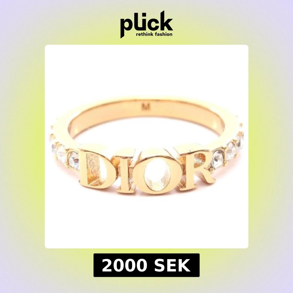 Superfin ring från Dior i guldton med stora bokstäver som stavar DIOR framtill. Ringen är dekorerad med gnistrande stenar runt hela bandet för extra bling. Perfekt statement piece för dig som gillar lyxiga accessoarer och vill sticka ut. Storlek M som är 16,5mm.