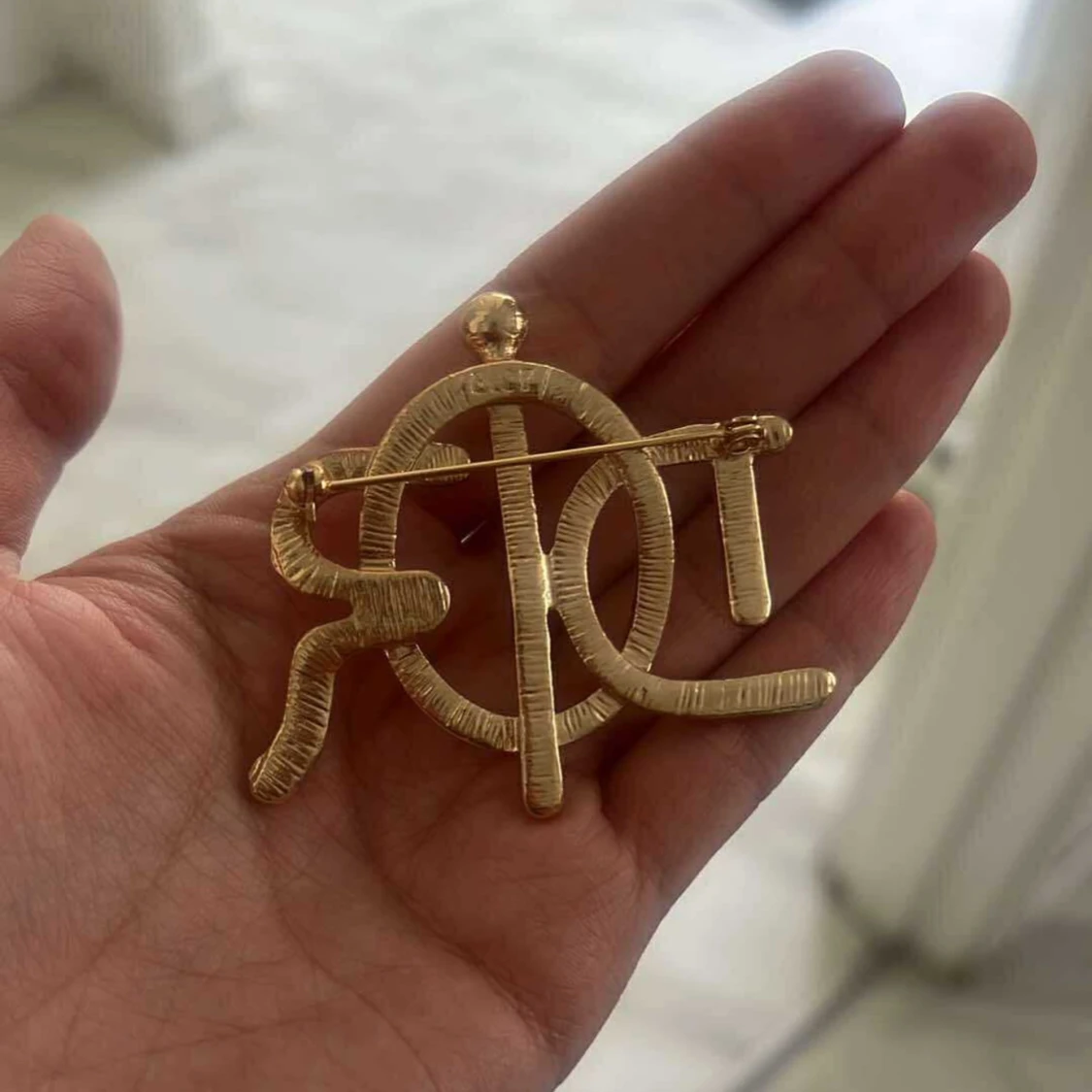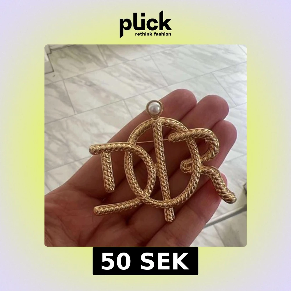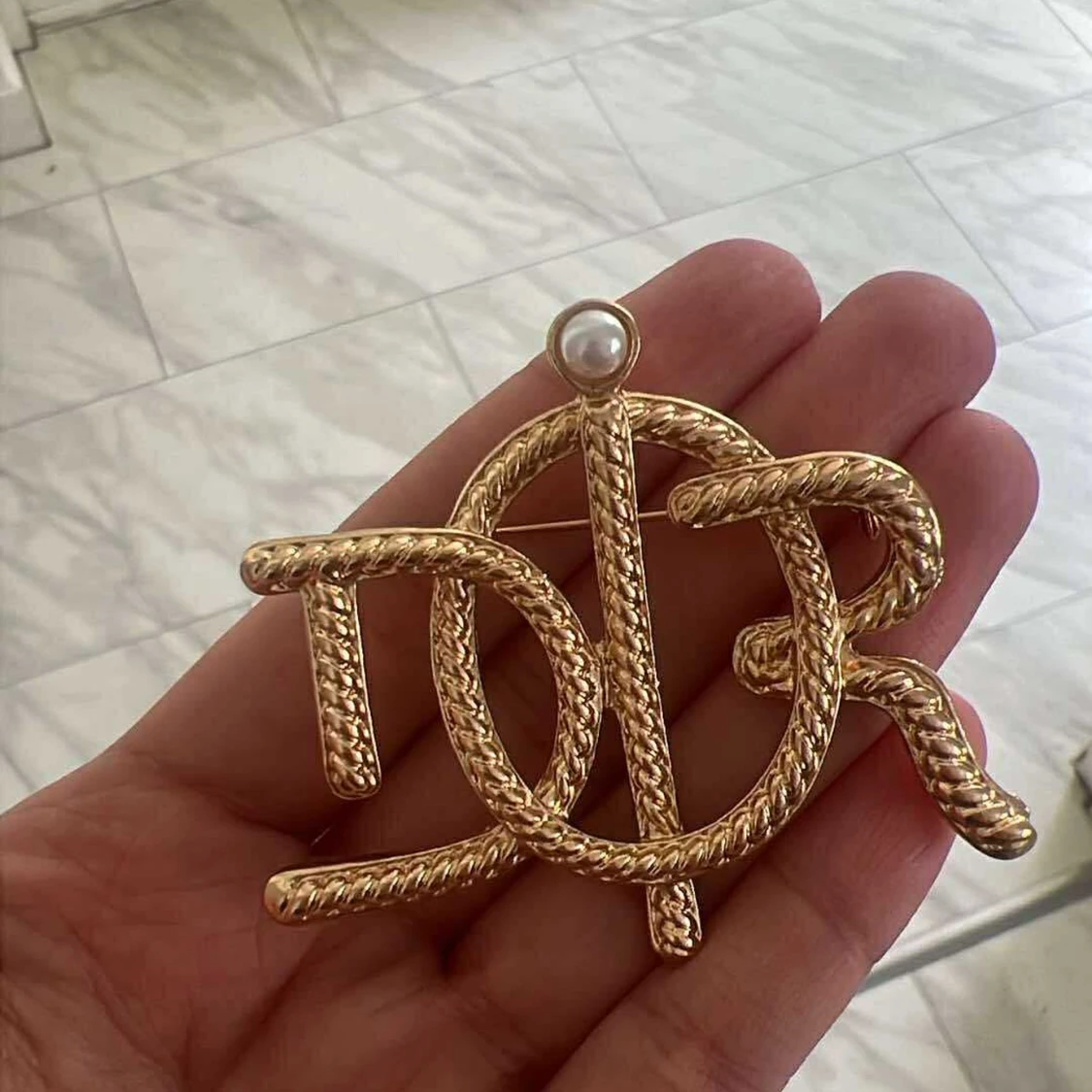 Säljer en lyxig brosch från Dior i guldtonad metall med tvinnad repstruktur och en elegant pärldetalj upptill. Broschen har den ikoniska CD-loggan och är perfekt för att ge din outfit en exklusiv touch.