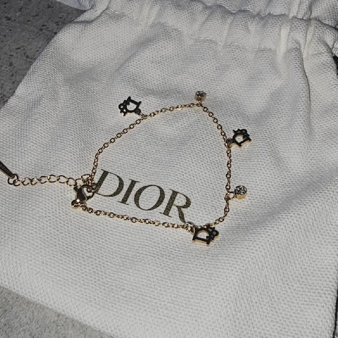Snyggt och trendigt armband fi guldton med tunna kedjor och små berlocker, inklusive Dior-bokstäver och glittrande detaljer. Perfekt accessoar för att lyfta din outfit med en lyxig touch.