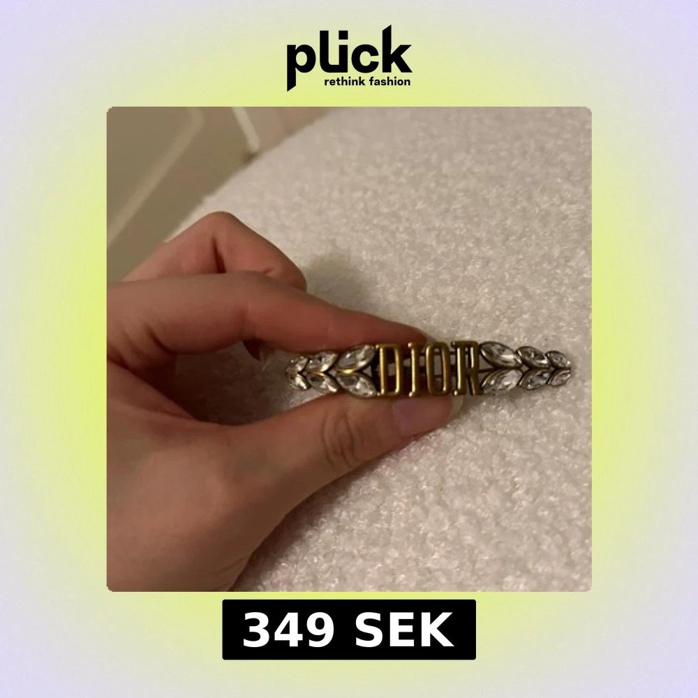 Elegant hårspänne från Dior i guld med glittrande kristaller. Perfekt för att ge en lyxig touch till din frisyr. Spännet har en stilren design med Dior-loggan i mitten och kristaller på sidorna.