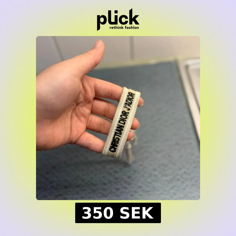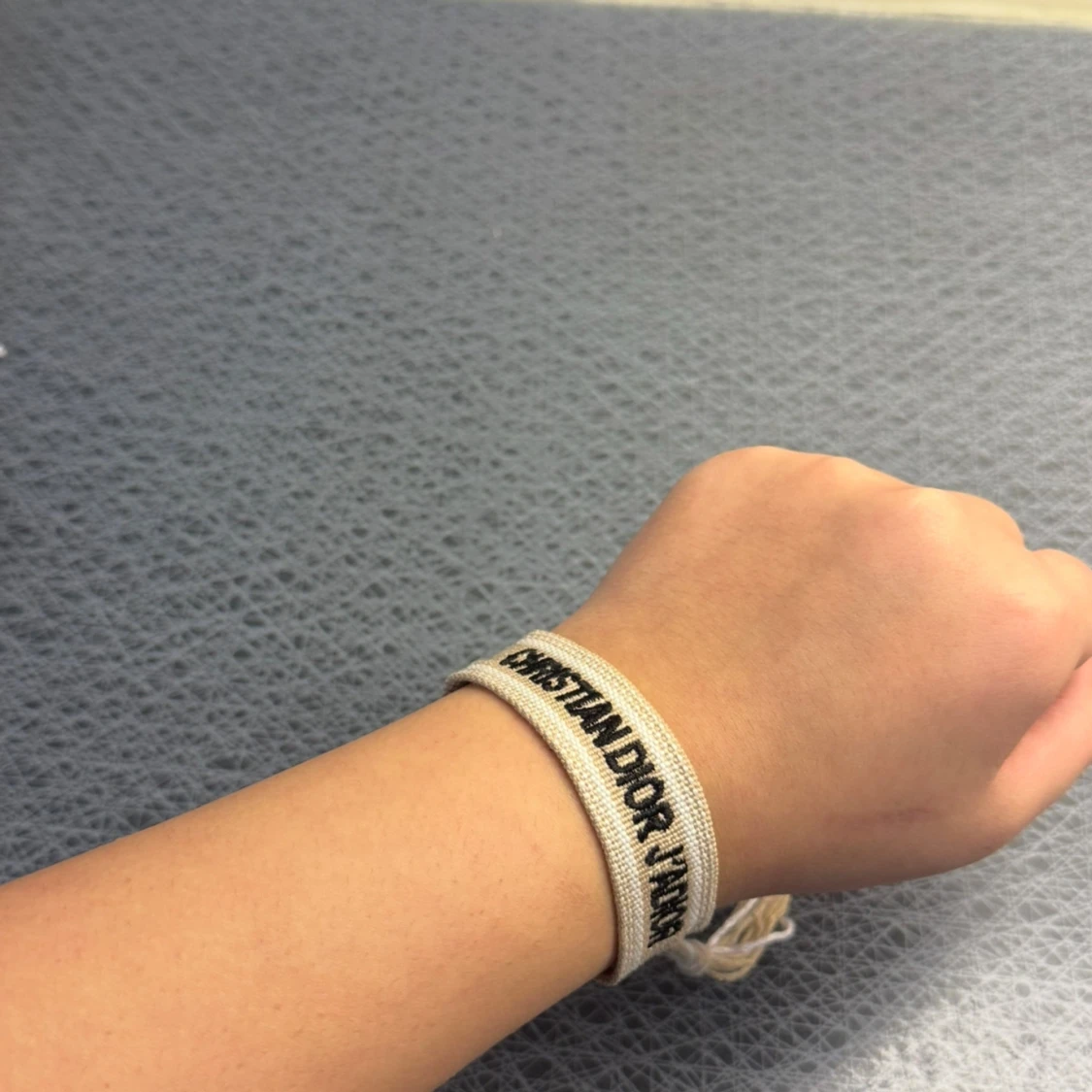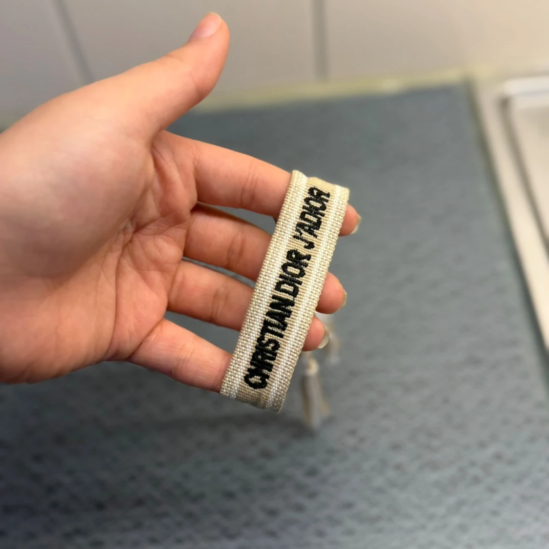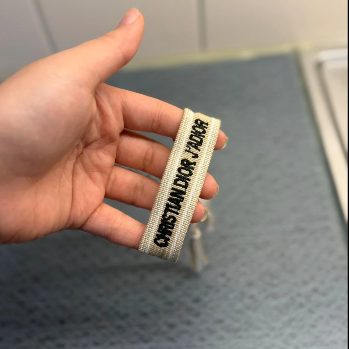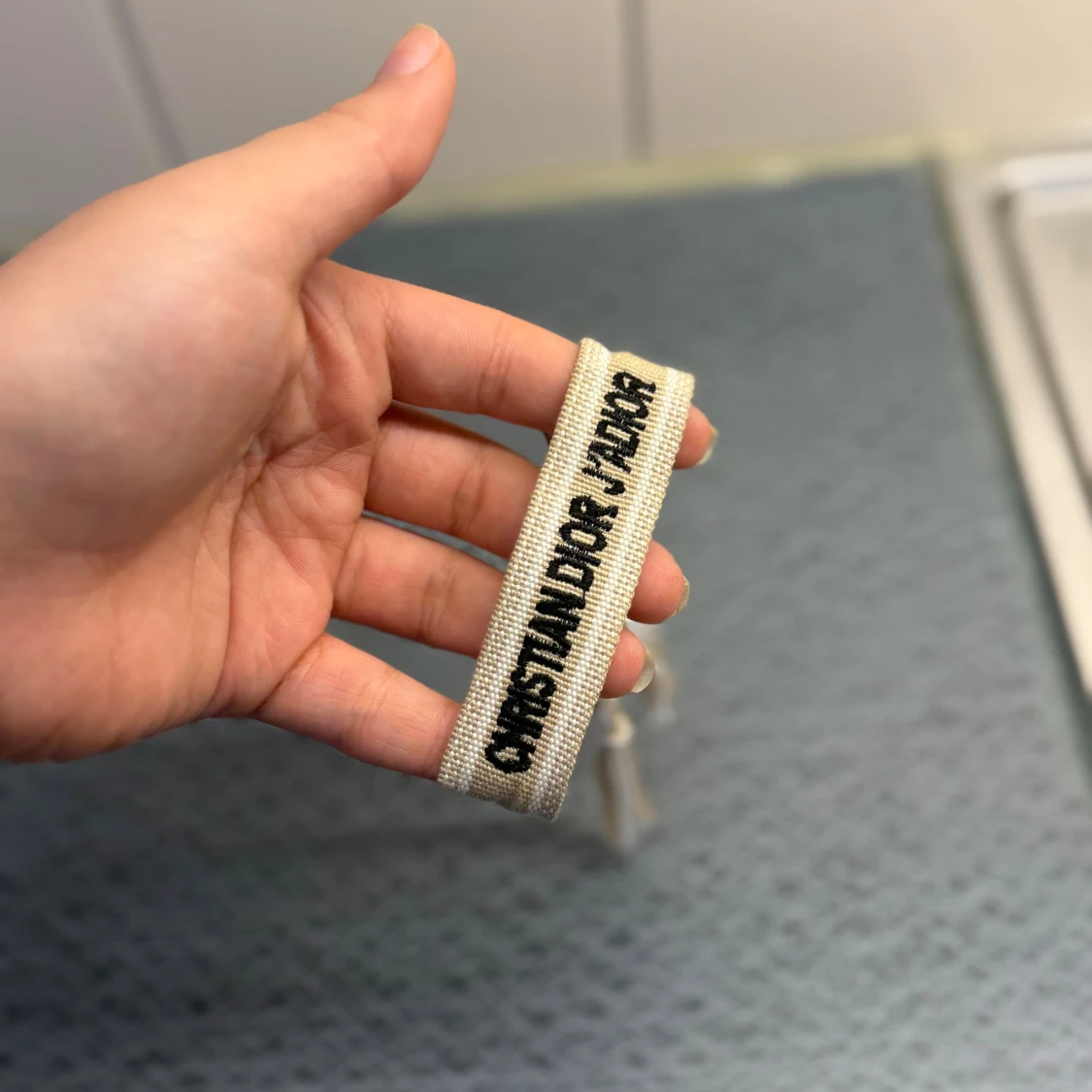 Snyggt beige armband från Christian Dior med svart broderad logga. Armbandet är gjort i textil och har justerbara snören med tofsar i ändarna. Perfekt för dig som vill ha en lyxig och trendig accessoar med designer-vibe.