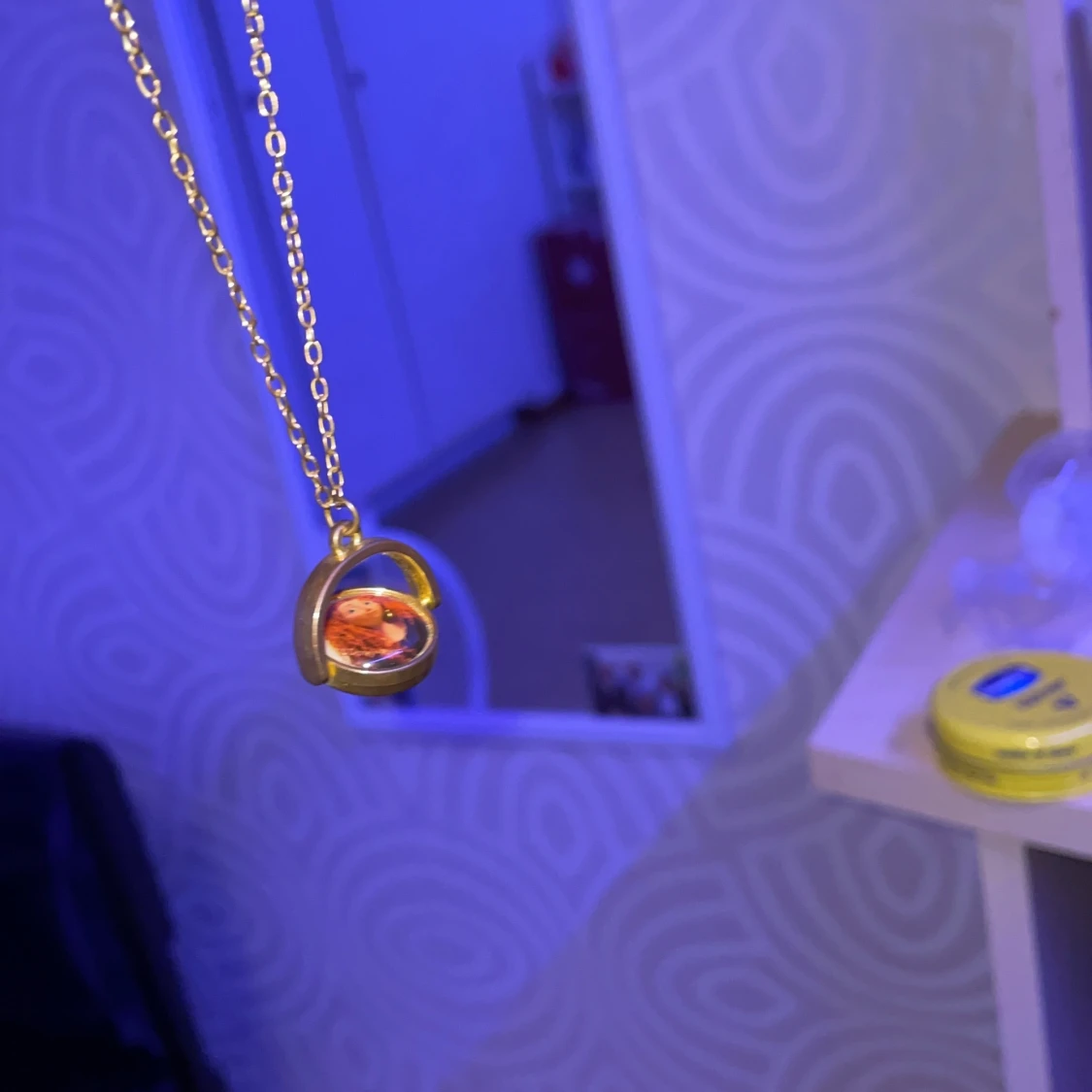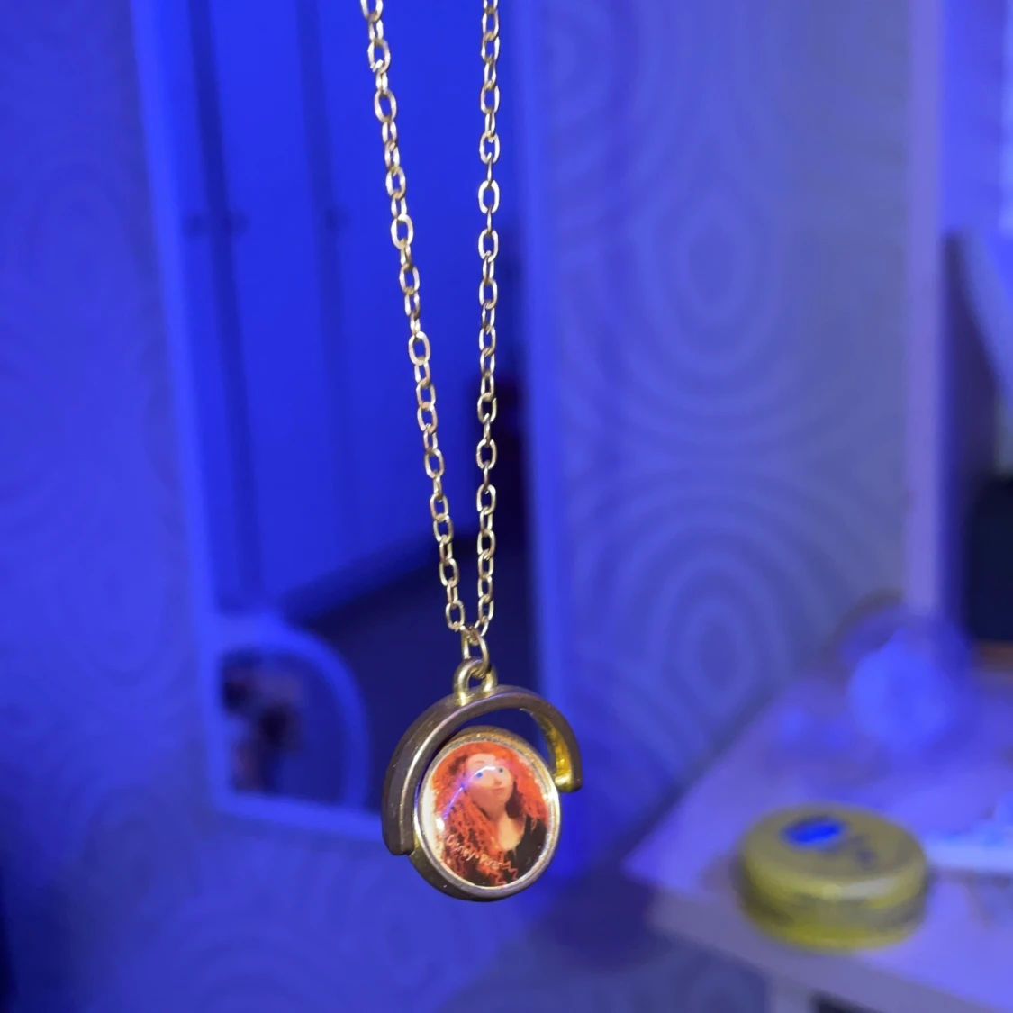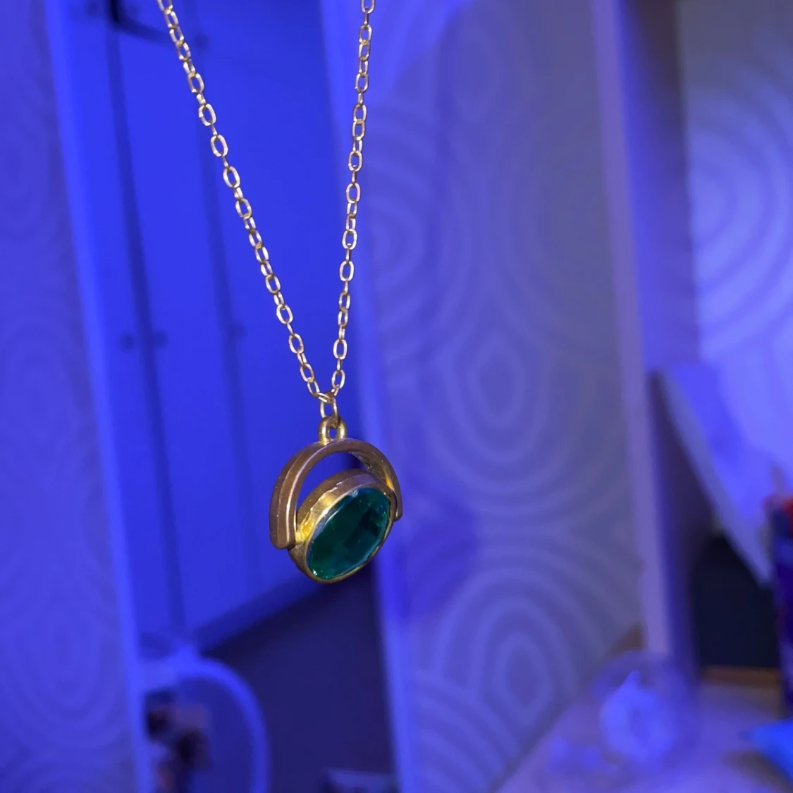 Ett gulligt halsband som är lite slitet. På ena sidan har den en grön sten och på andra en disney figur.