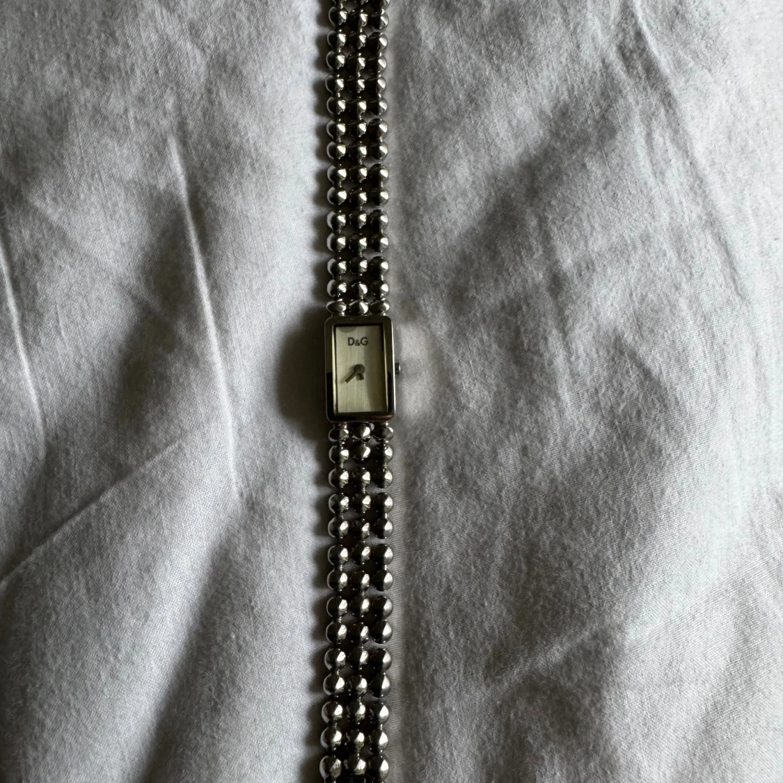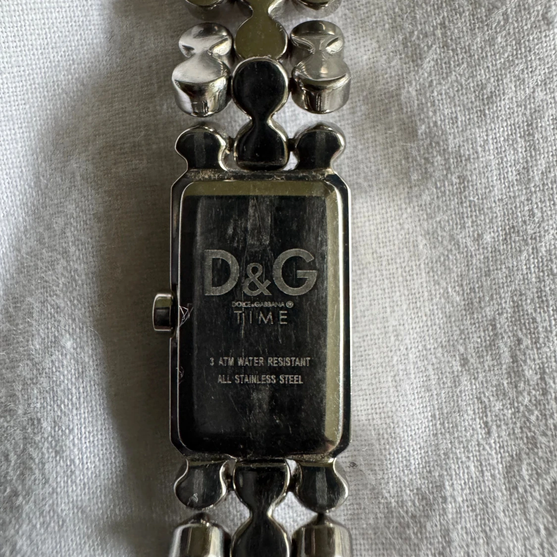 Säljer en stilren klocka från D&G med rektangulär urtavla och coolt armband i tre rader av blanka, runda länkar. Klockan är helt i silverfärgat rostfritt stål och har minimalistisk design med D&G-logga på urtavlan. Perfekt accessoar för att lyfta din outfit.