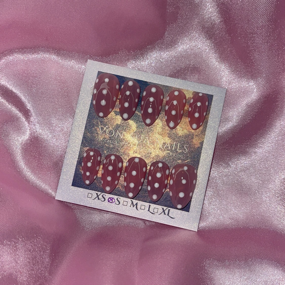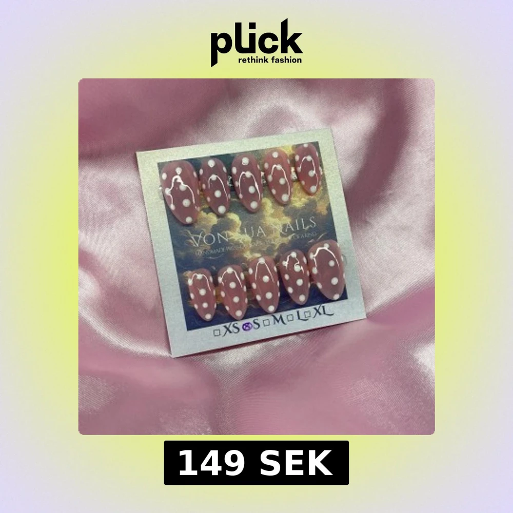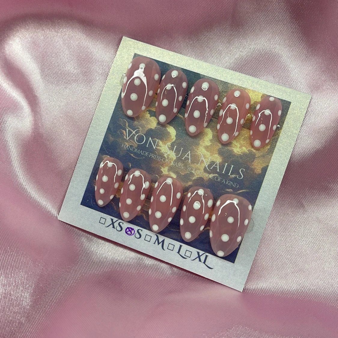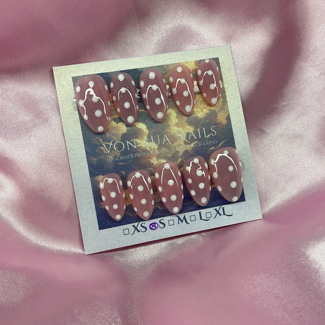 Snygga handgjorda press-on naglar i kort mandelform med ljusrosa bas och vita prickar. Perfekt för dig som vill ha unika och trendiga naglar utan att gå till salong. Kommer i S: 15 mm, 11,5 mm, 12 mm, 11 mm, 9 mm , och är enkla att applicera.