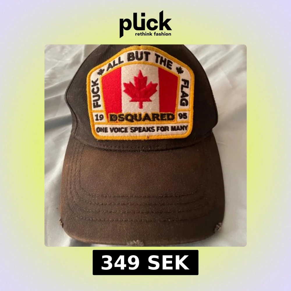 Säljer en svart keps från Dsquared2 med stor broderad patch framtill i rött, vitt och gult. Patchen har ett kanadensiskt lönnlöv och texten 'ALL BUT THE FLAG'. Kepsen har böjd skärm och justerbar baksida. Materialet är bomull.